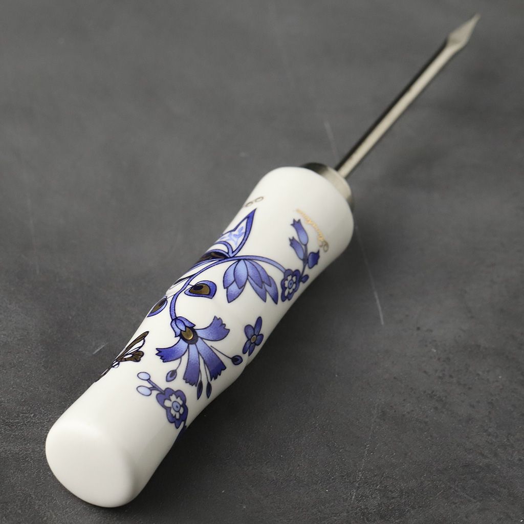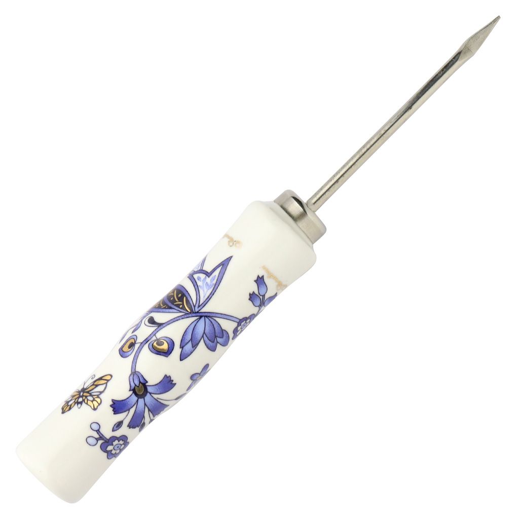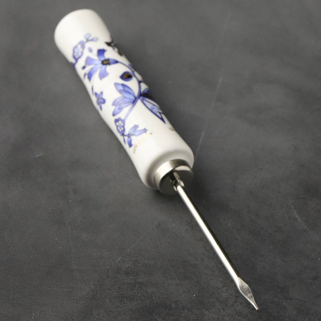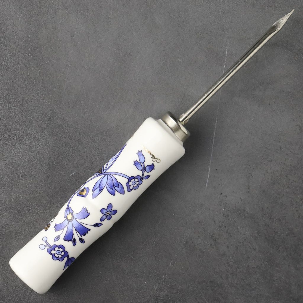 Металлическое шило для колки пуэра с белой керамической ручкой, декорированной монохромным изображением синих цветов
