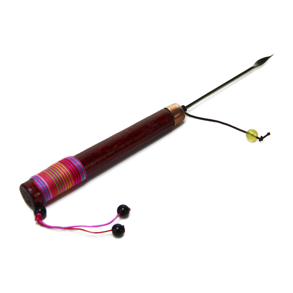 Шило для колки пуэра с деревянной ручкой, декорировано цветными нитками и бусинами, одна из которых несет функцию колпачка.