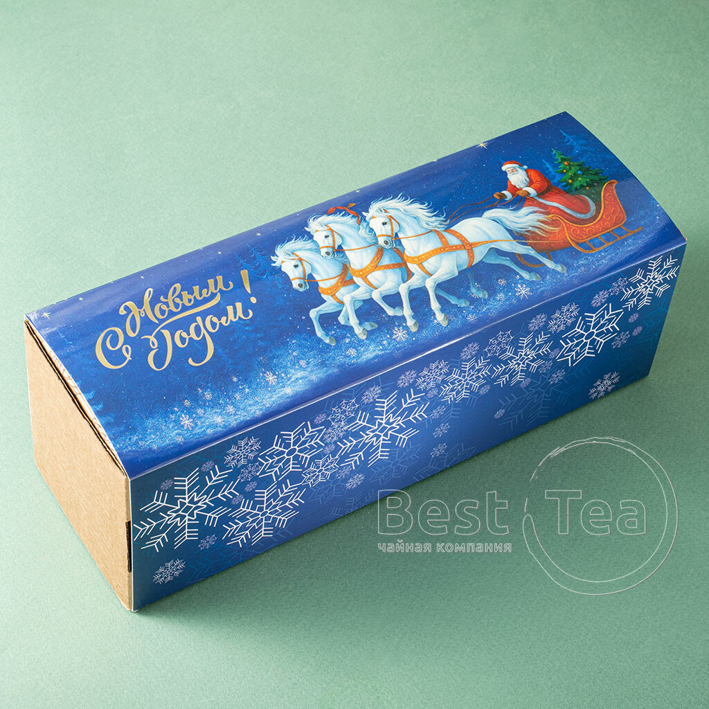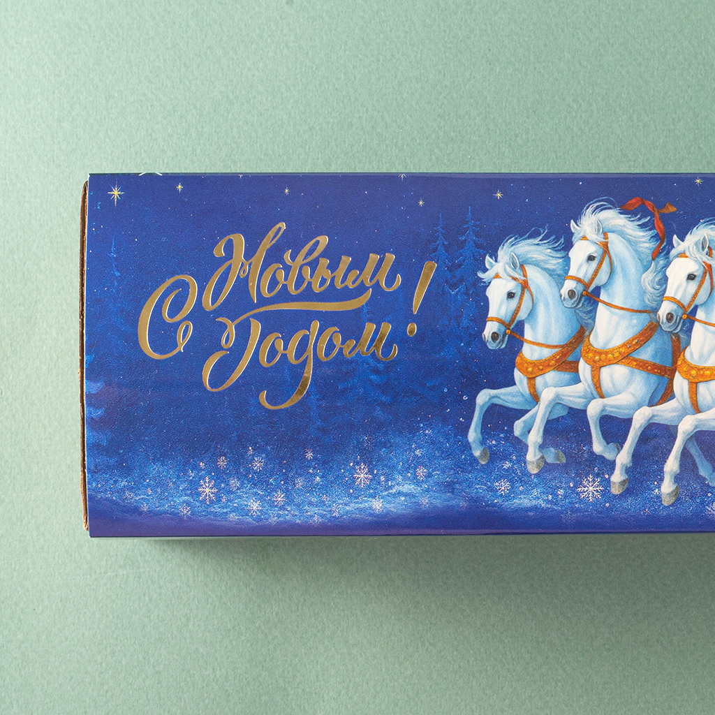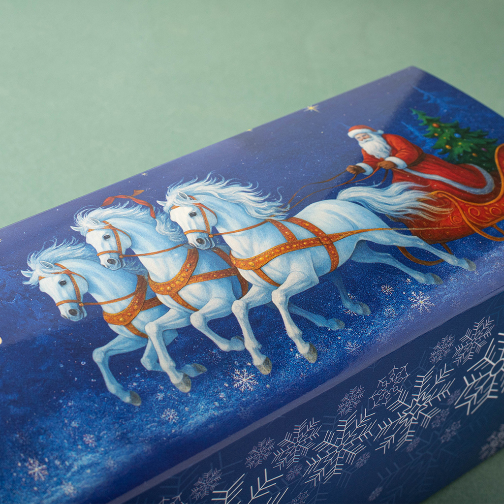 Шубер из плотного картона. Его праздничный дизайн с традиционной тройкой лошадей и Дедом Морозом создаёт новогоднее настроение.