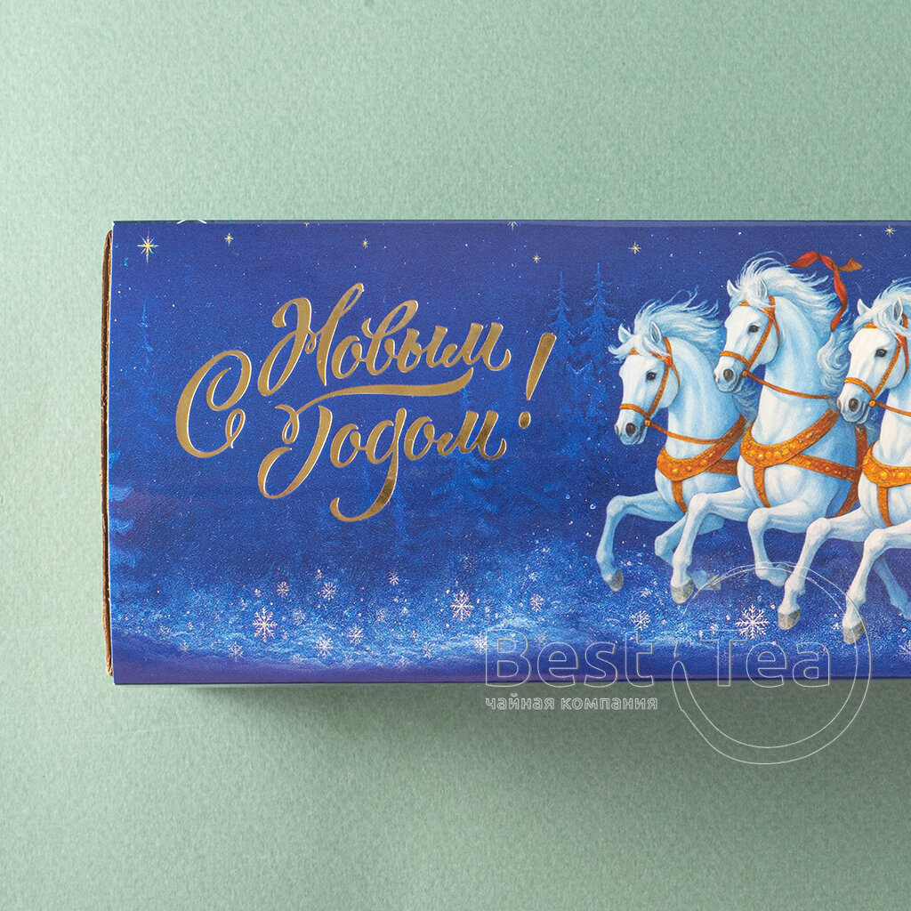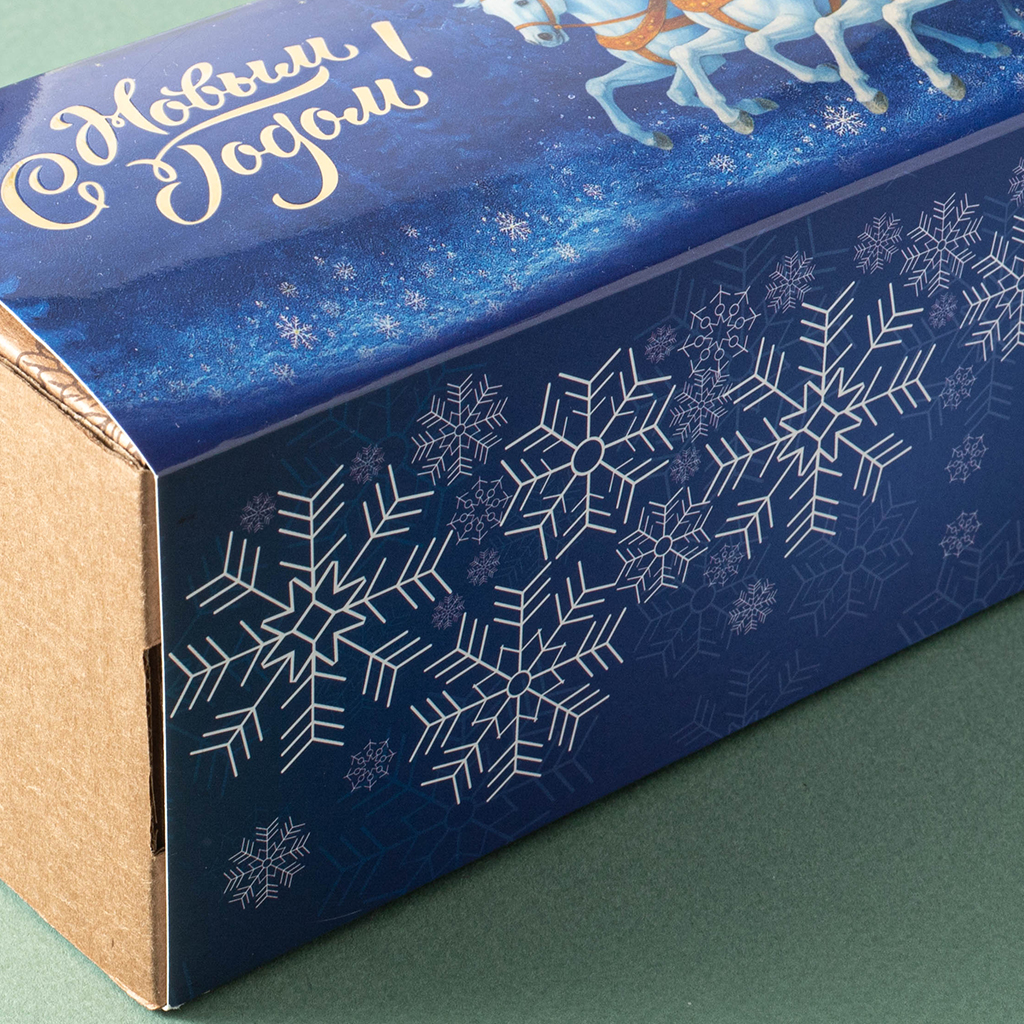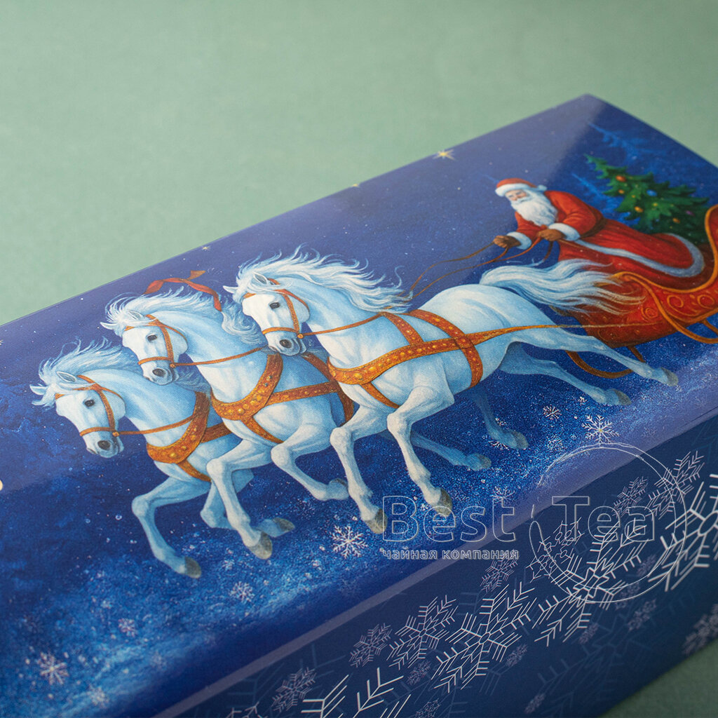 Шубер из плотного картона. Его праздничный дизайн с традиционной тройкой лошадей и Дедом Морозом создаёт новогоднее настроение.