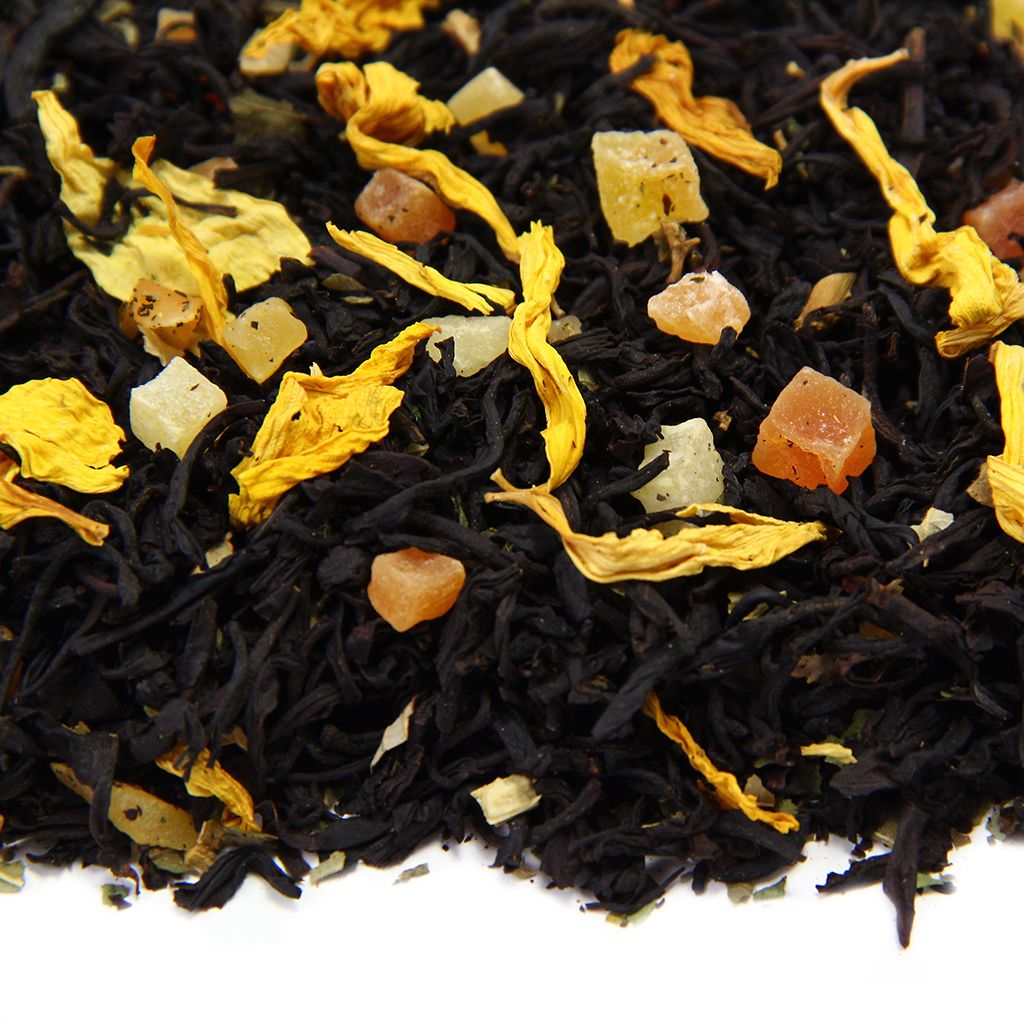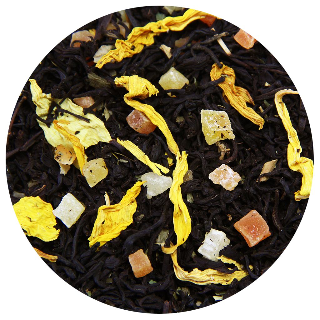 Чай черный индийский, кусочки ананаса, кусочки папайи, лепестки календулы, листья ежевики, аромат папайи.