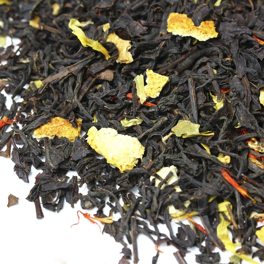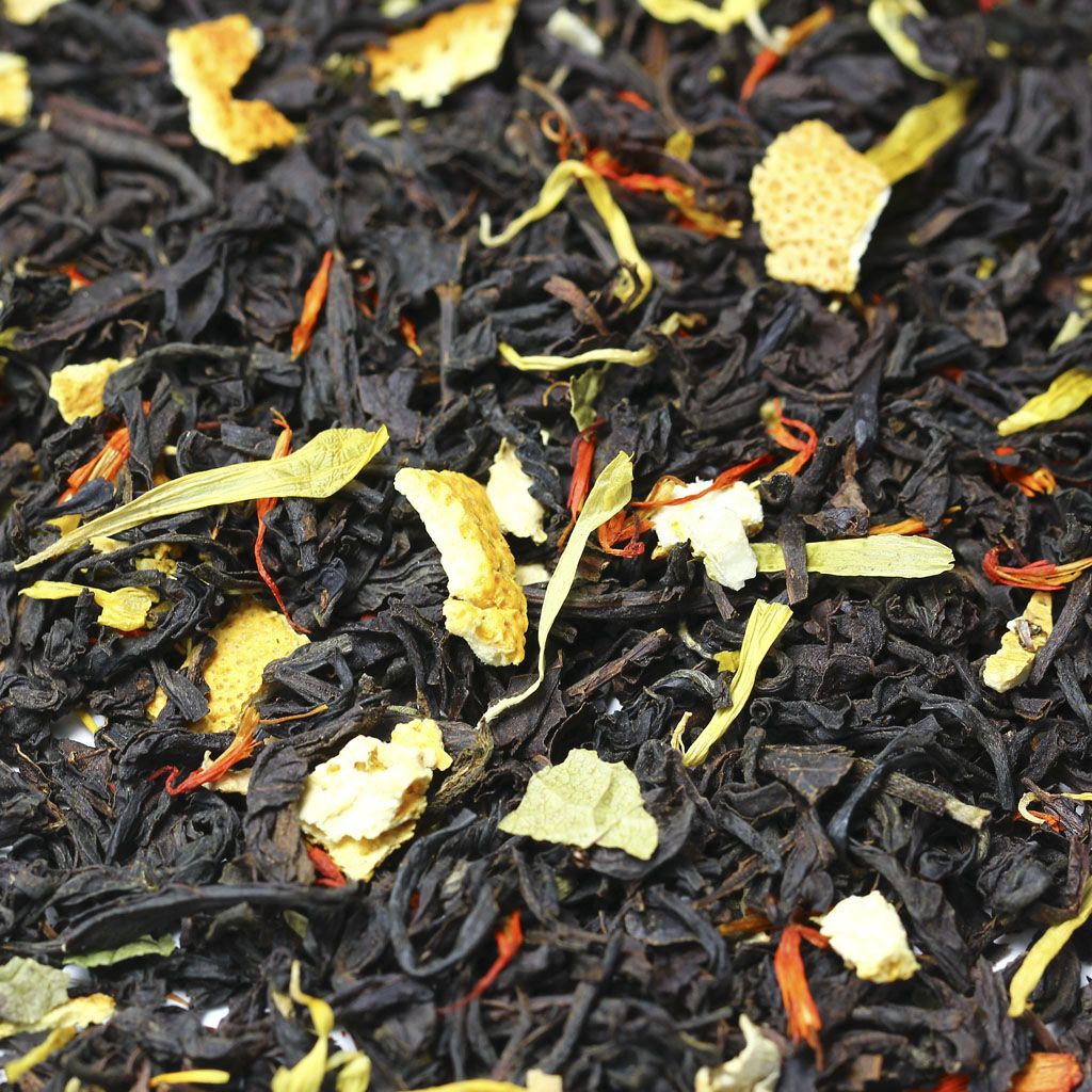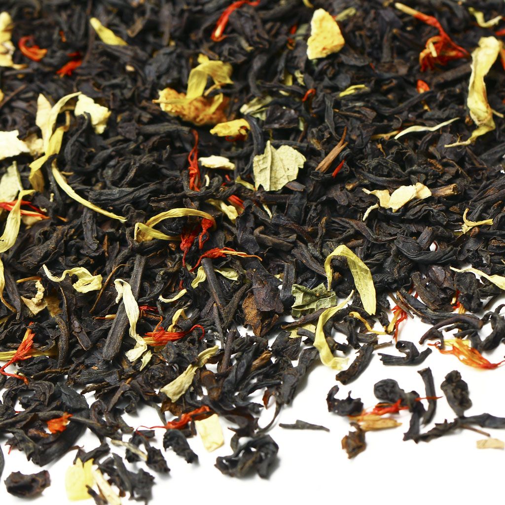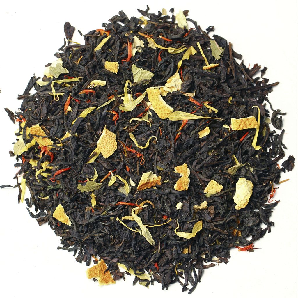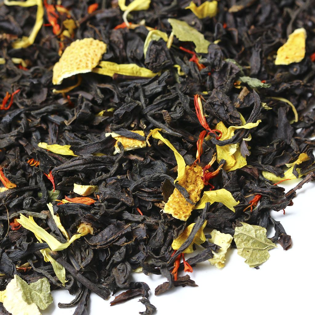 Чай черный индийский, цедра апельсина, цедра лимона, лепестки сафлора, лепестки календулы, листья смородины, аромат красного апельсина.