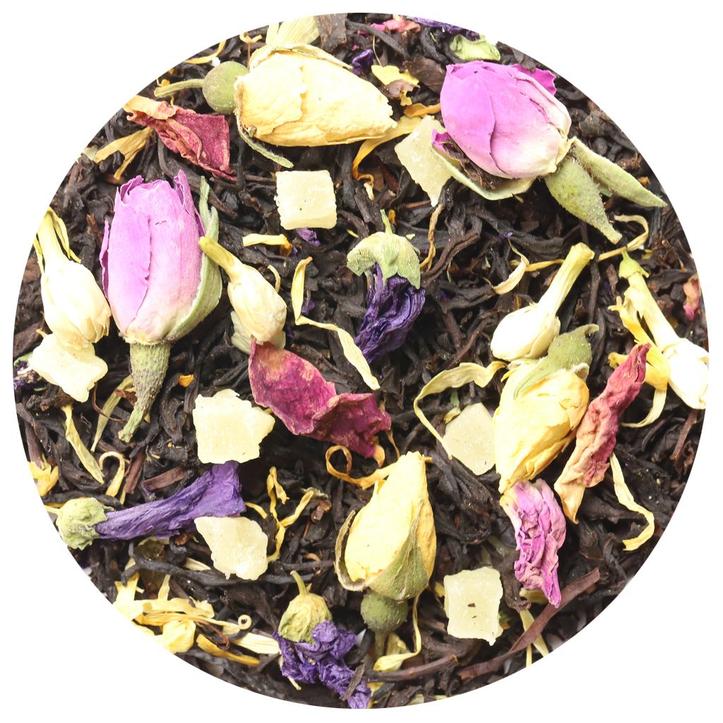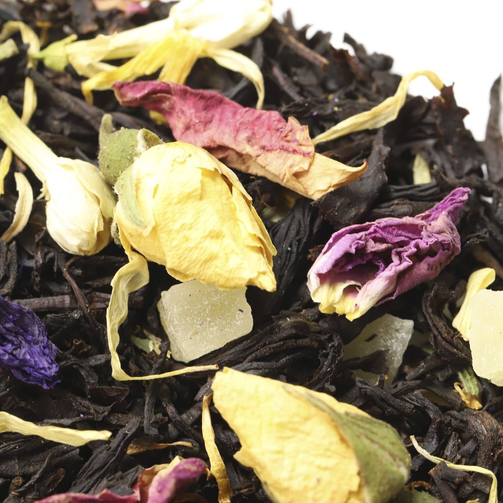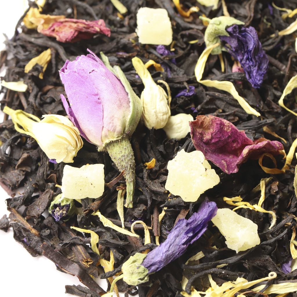 Чай черный цейлонский высокогорный, кусочки ананаса, бутоны роз, цветы жасмина, цветы мальвы, лепестки календулы, лепестки розы, аромат манго и ананаса.