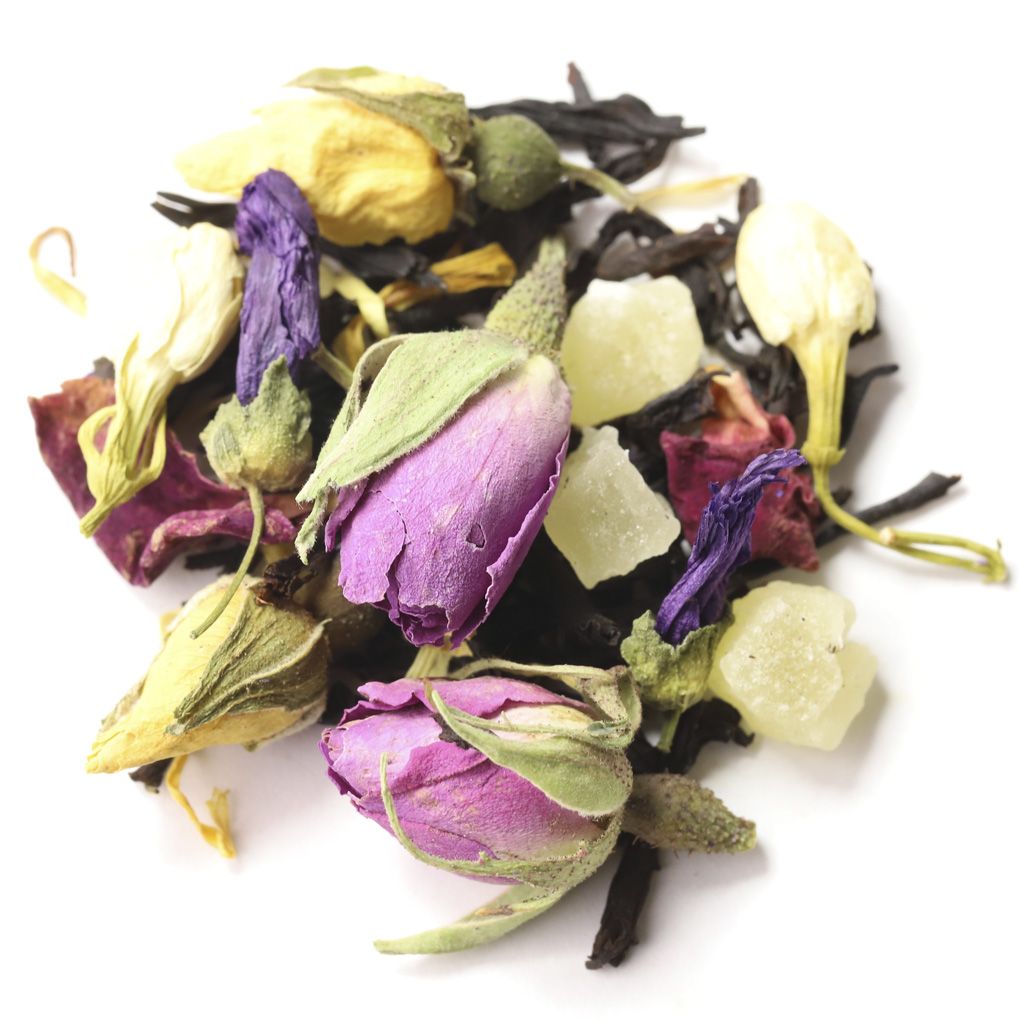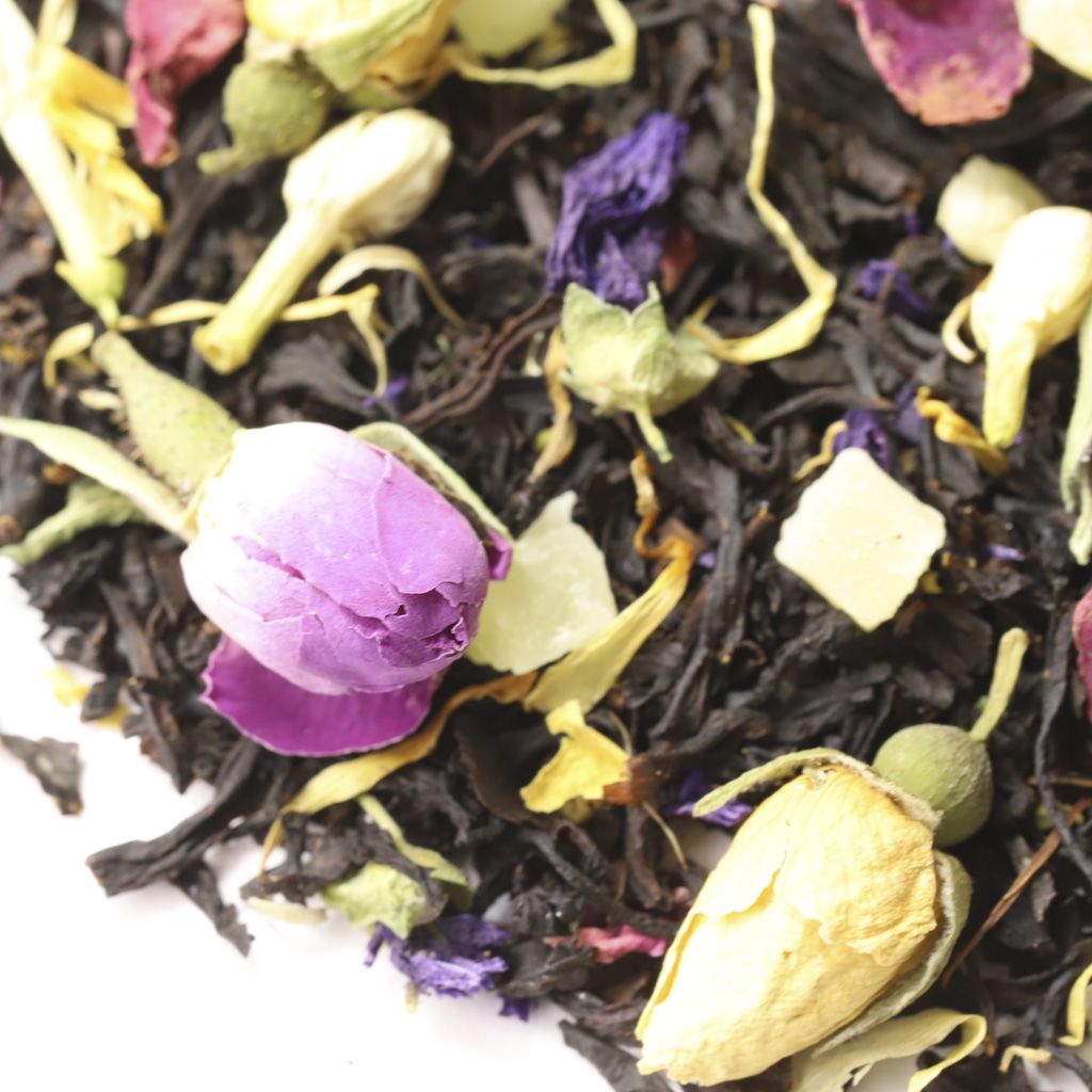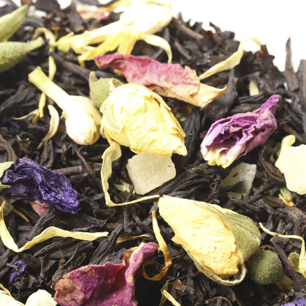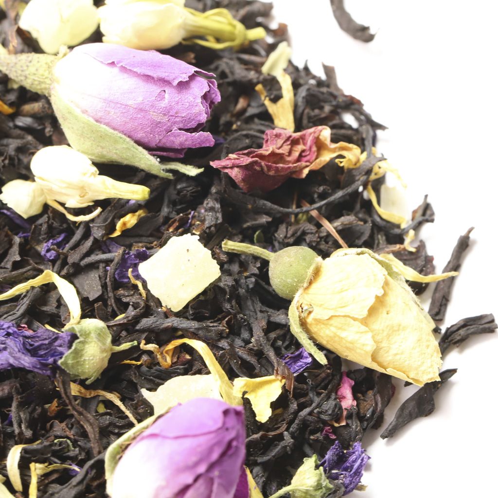 Чай черный цейлонский высокогорный, кусочки ананаса, бутоны роз, цветы жасмина, цветы мальвы, лепестки календулы, лепестки розы, аромат манго и ананаса.