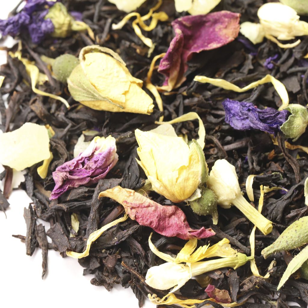 Красочный букет цельных цветков и бутонов, кусочков фруктов и ярких лепестков на фоне россыпи черного чая.