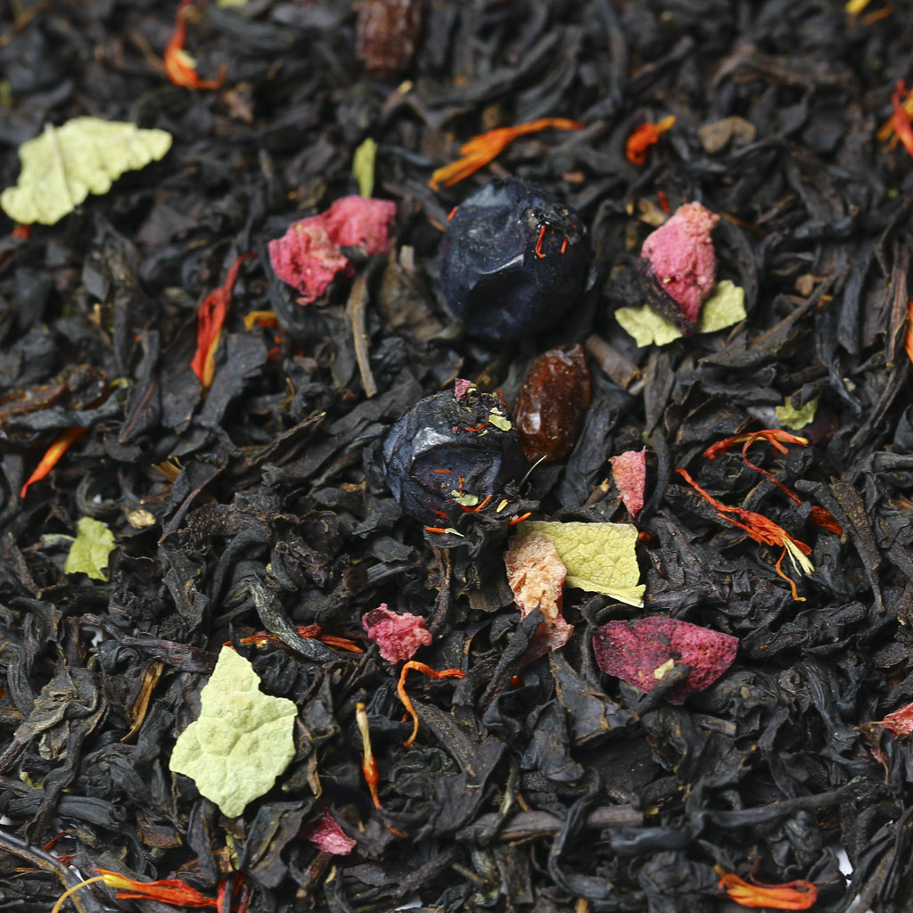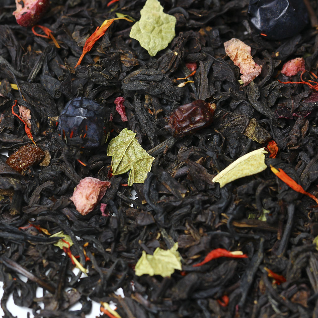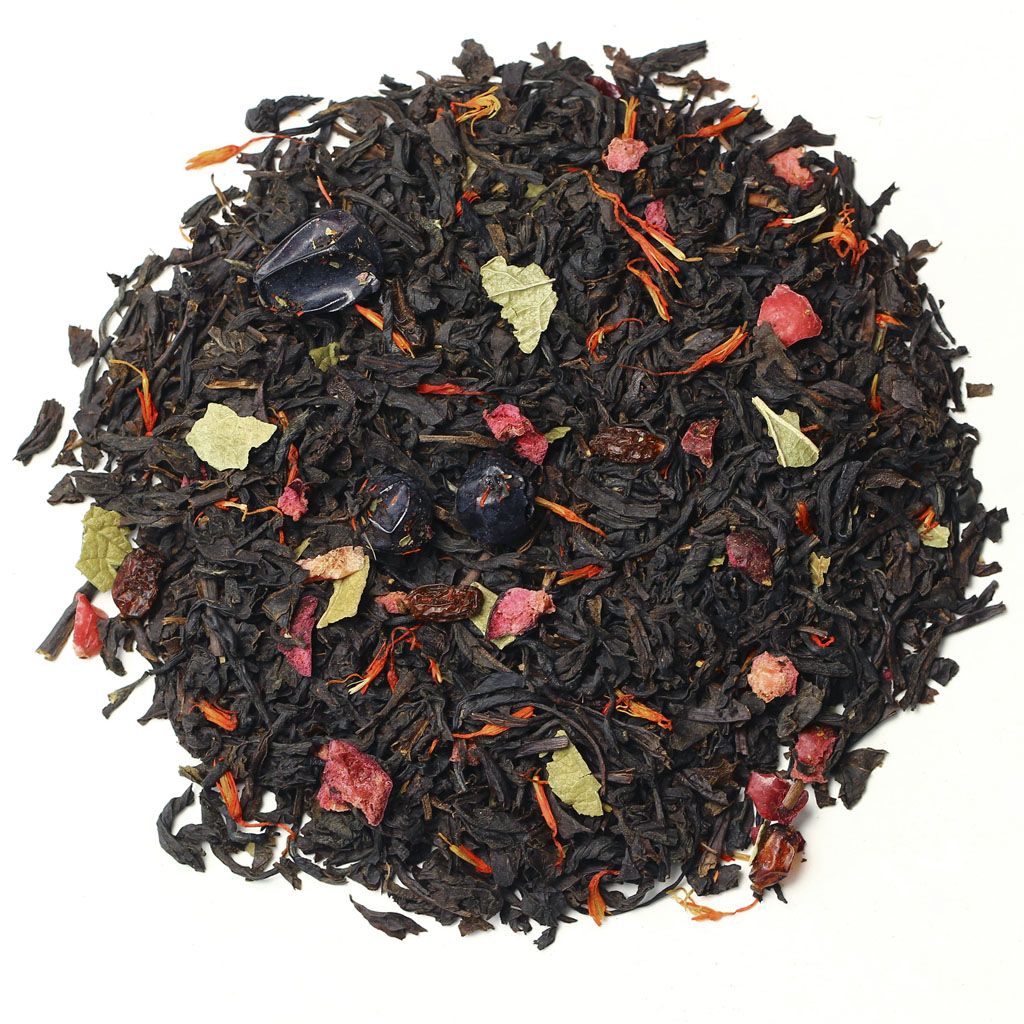 Черный индийский чай гармоничен сам по себе, но в сочетании с плодами красного и черного барбариса, кусочками клюквы, лепестками красного василька и листьями черной смородины раскрывается по-особому.