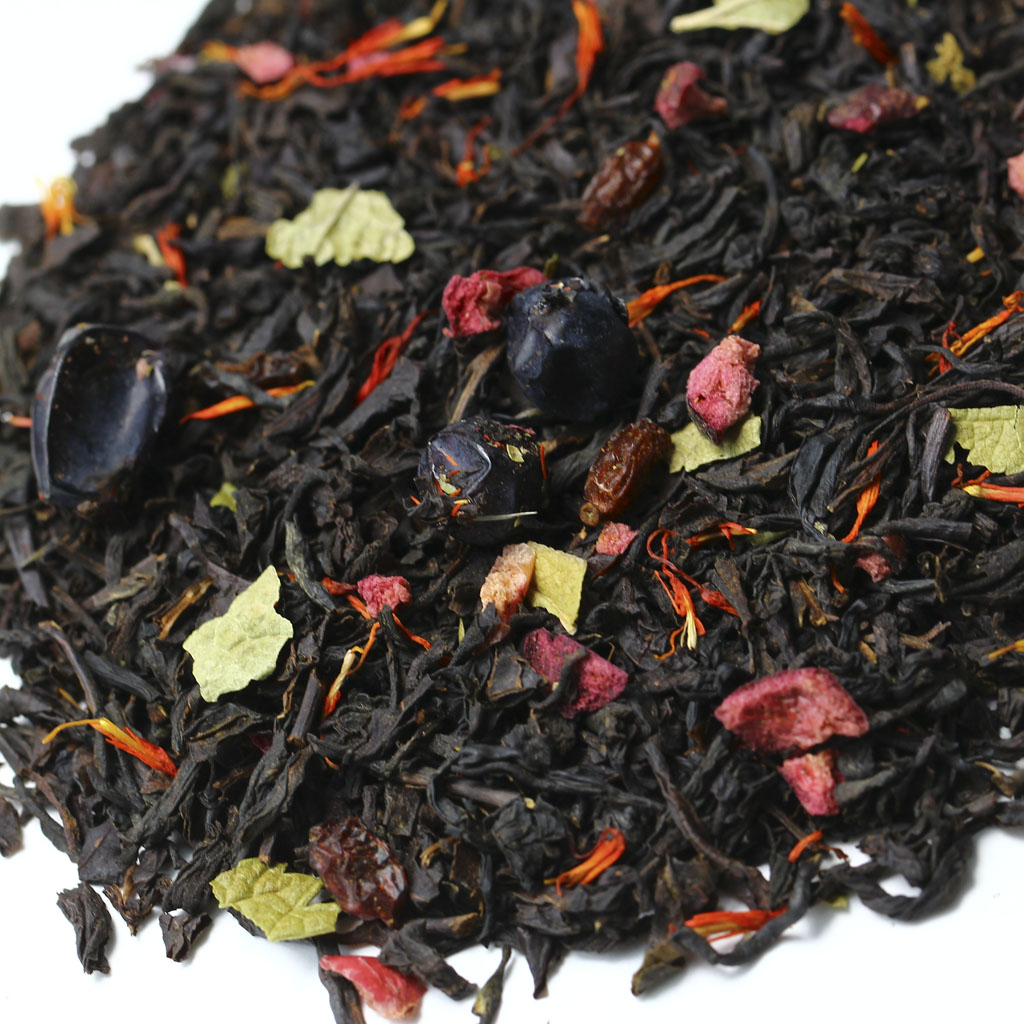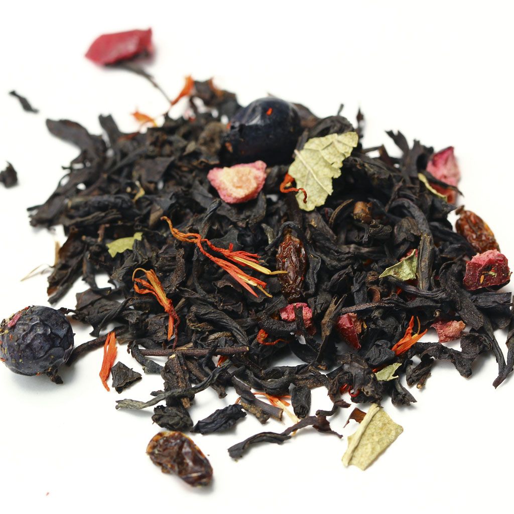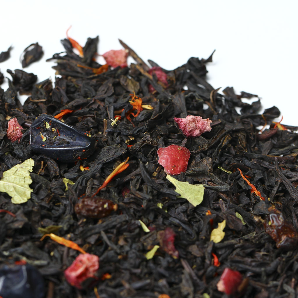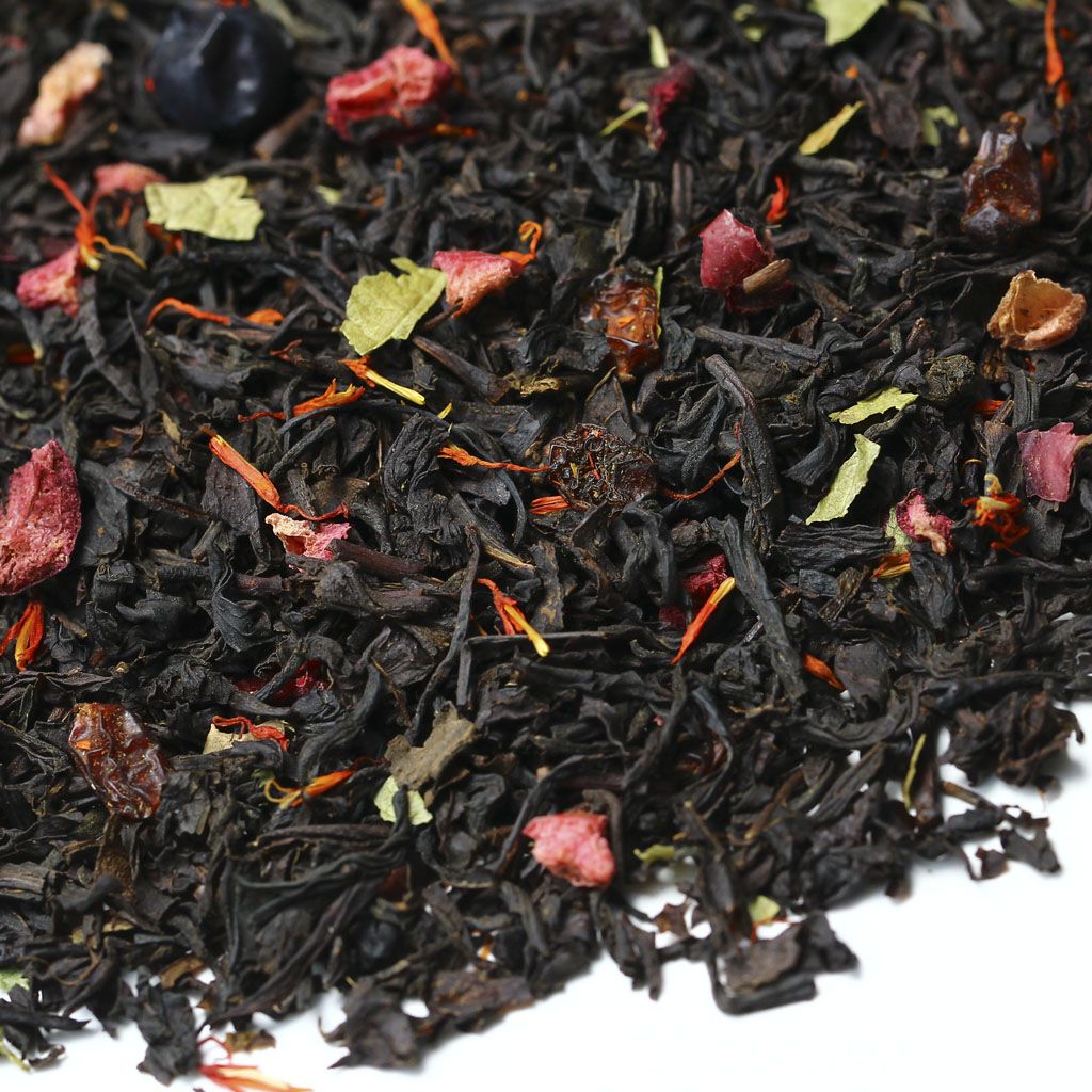 Черный индийский чай гармоничен сам по себе, но в сочетании с плодами красного и черного барбариса, кусочками клюквы, лепестками красного василька и листьями черной смородины раскрывается по-особому.