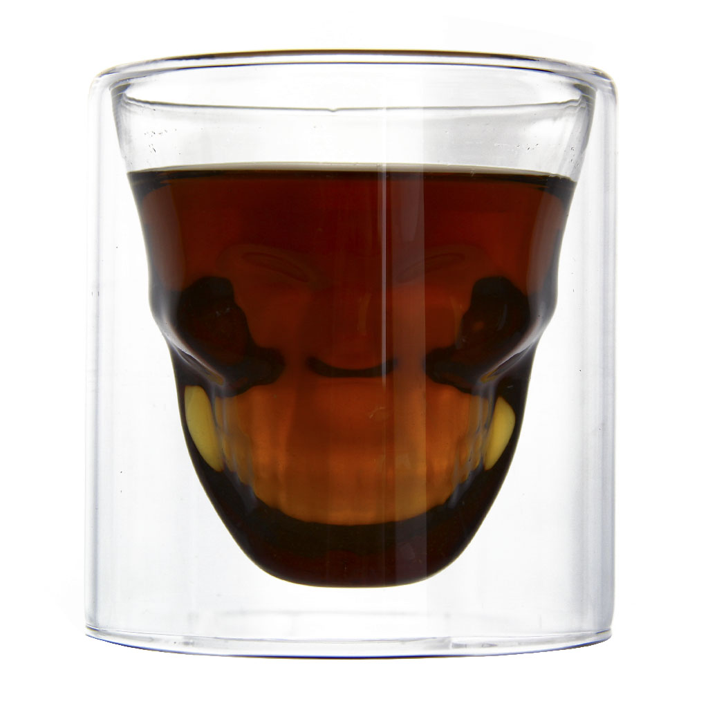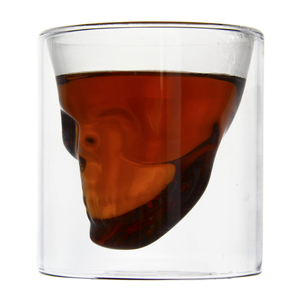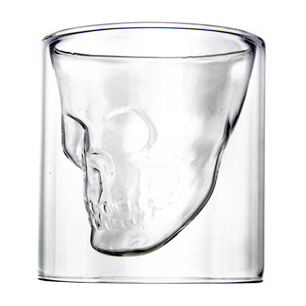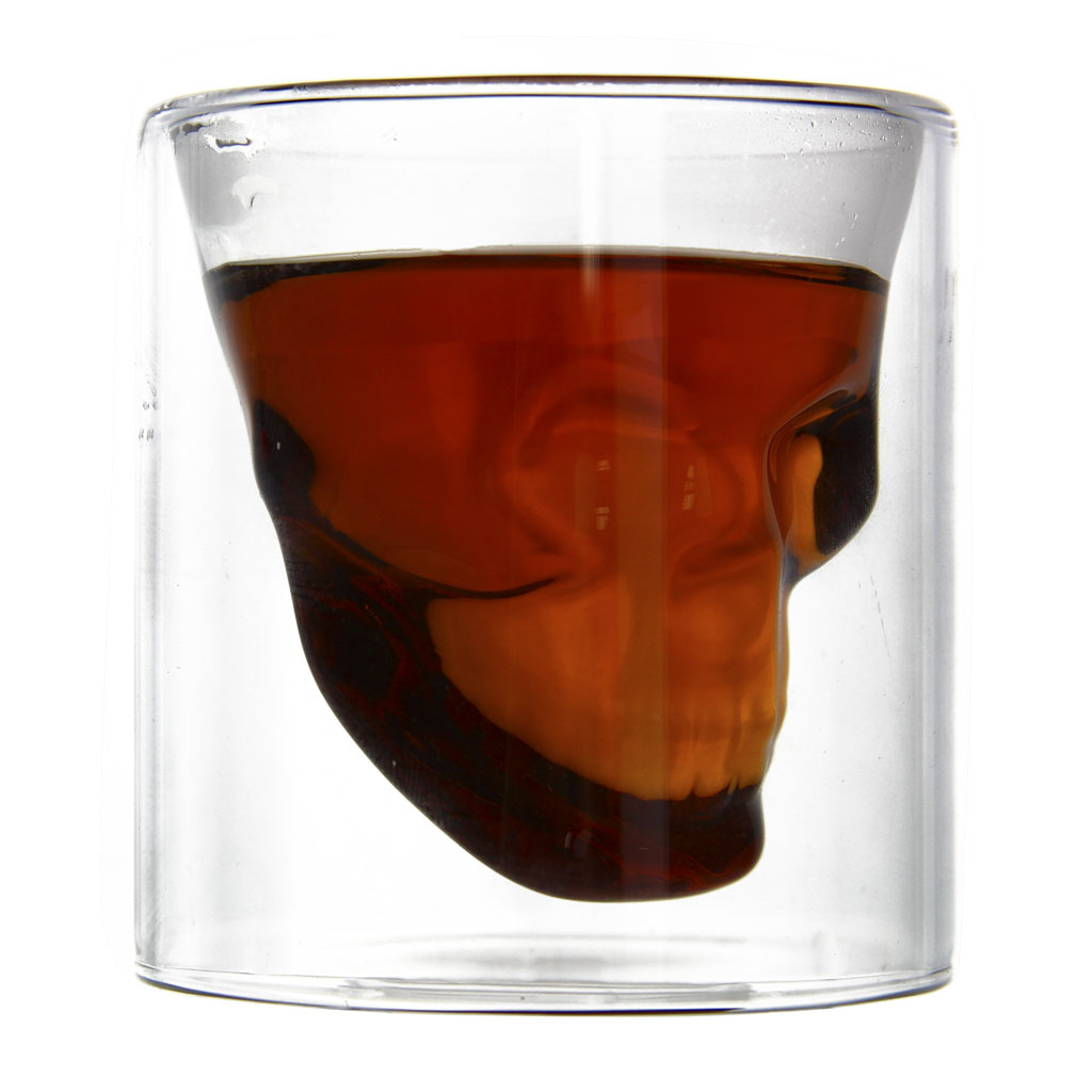 Стакан цилиндрической формы с внутренней емкостью в форме черепа, который эффектно прорисовывается будучи заполненным цветной жидкостью. Интересная и брутальная вещица, делающая распитие любого напитка эстетичным и запоминающимся.