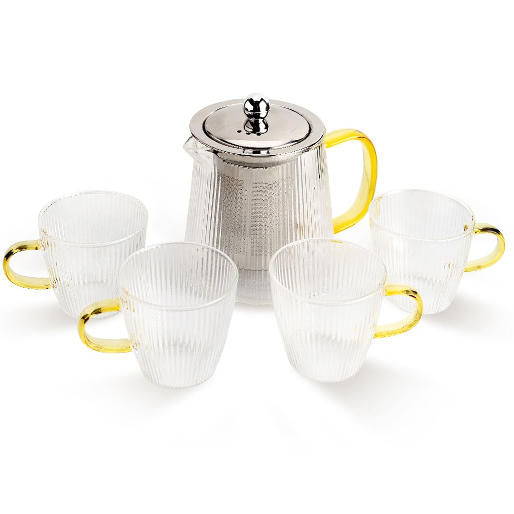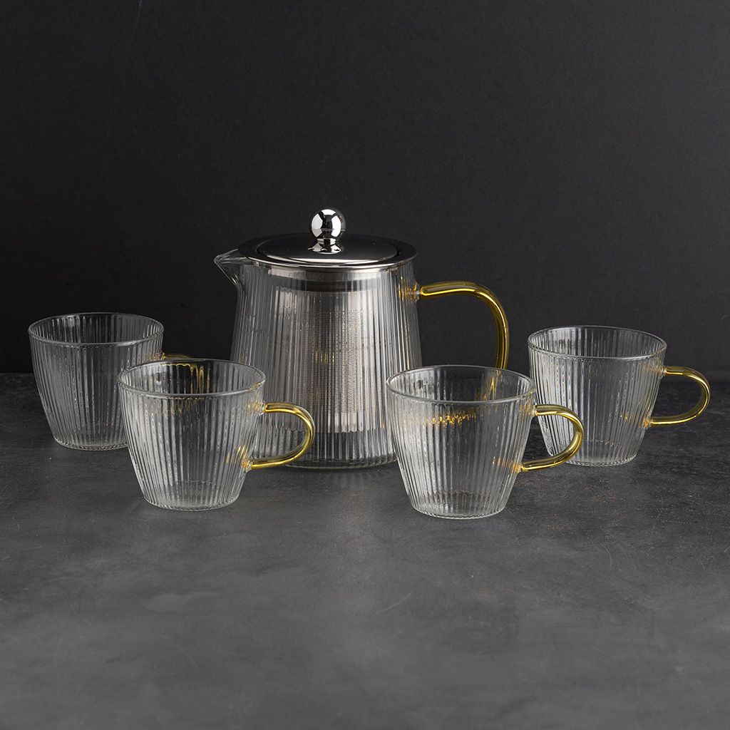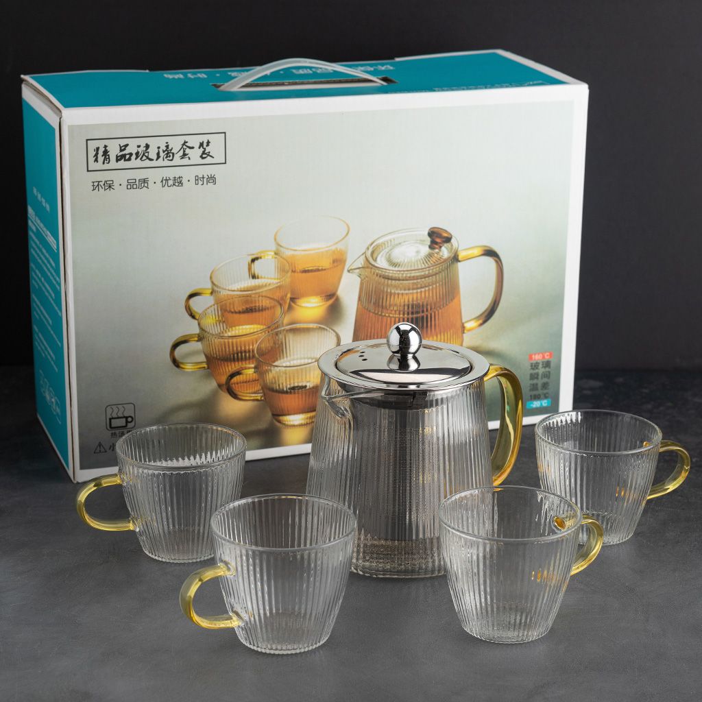 Стеклянный набор состоит из чайника и четырех кружек. Изделия выполнены из термостойкого боросиликатного стекла. Посуда предназначена как для горячих, так и для холодных напитков.