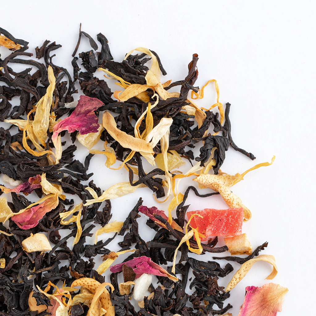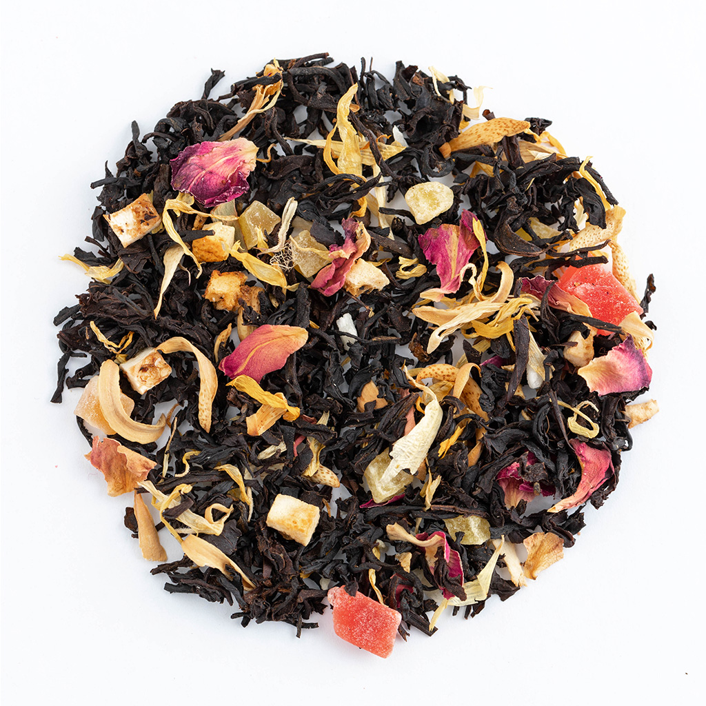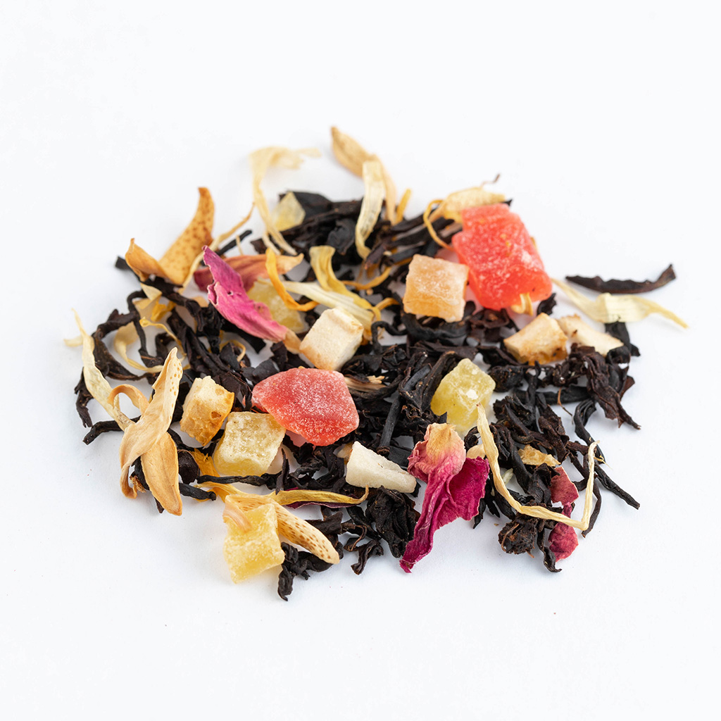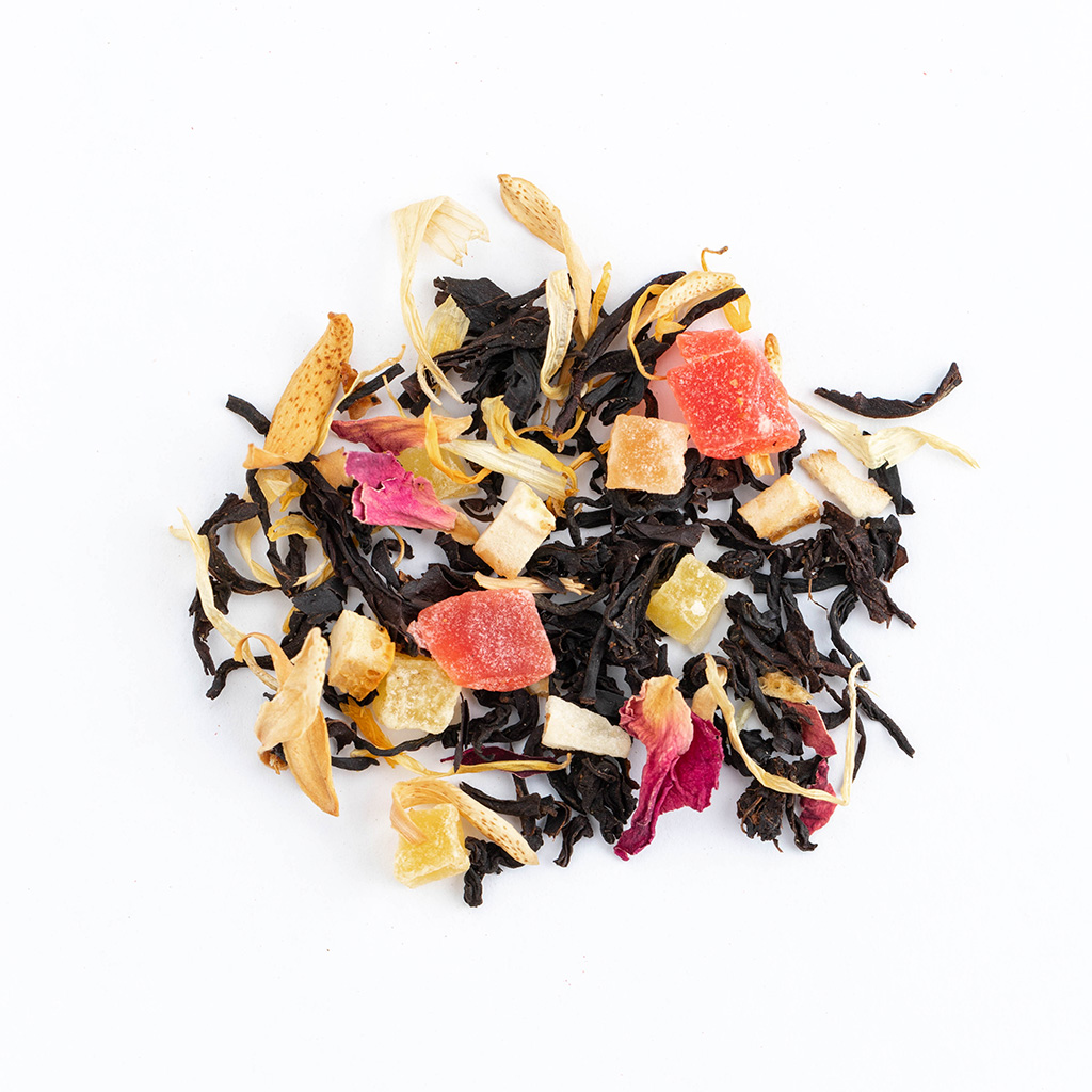 Чай черный индийский, кусочки папайи, кусочки ананаса, кусочки апельсина с цедрой, кусочки лимона с цедрой, кокосовая стружка, лепестки розы, лепестки календулы, аромат тропических фруктов.