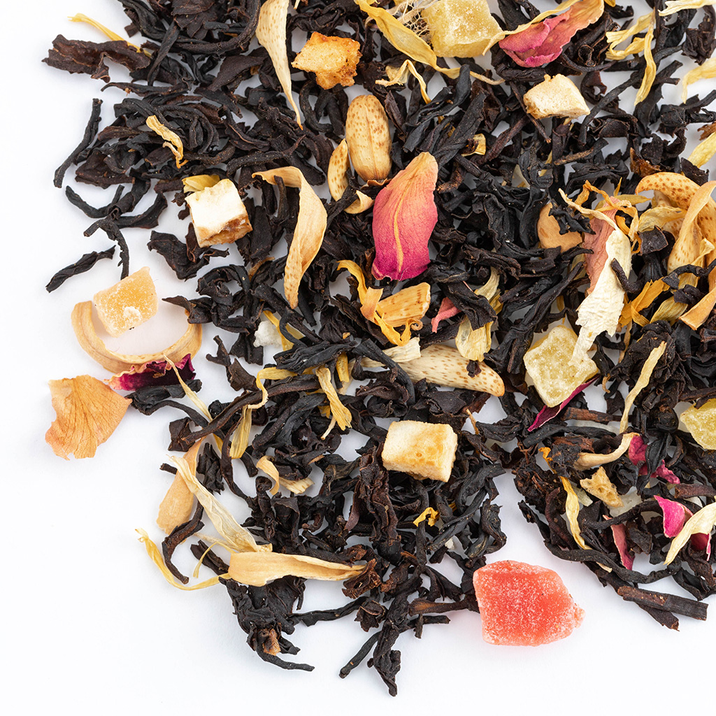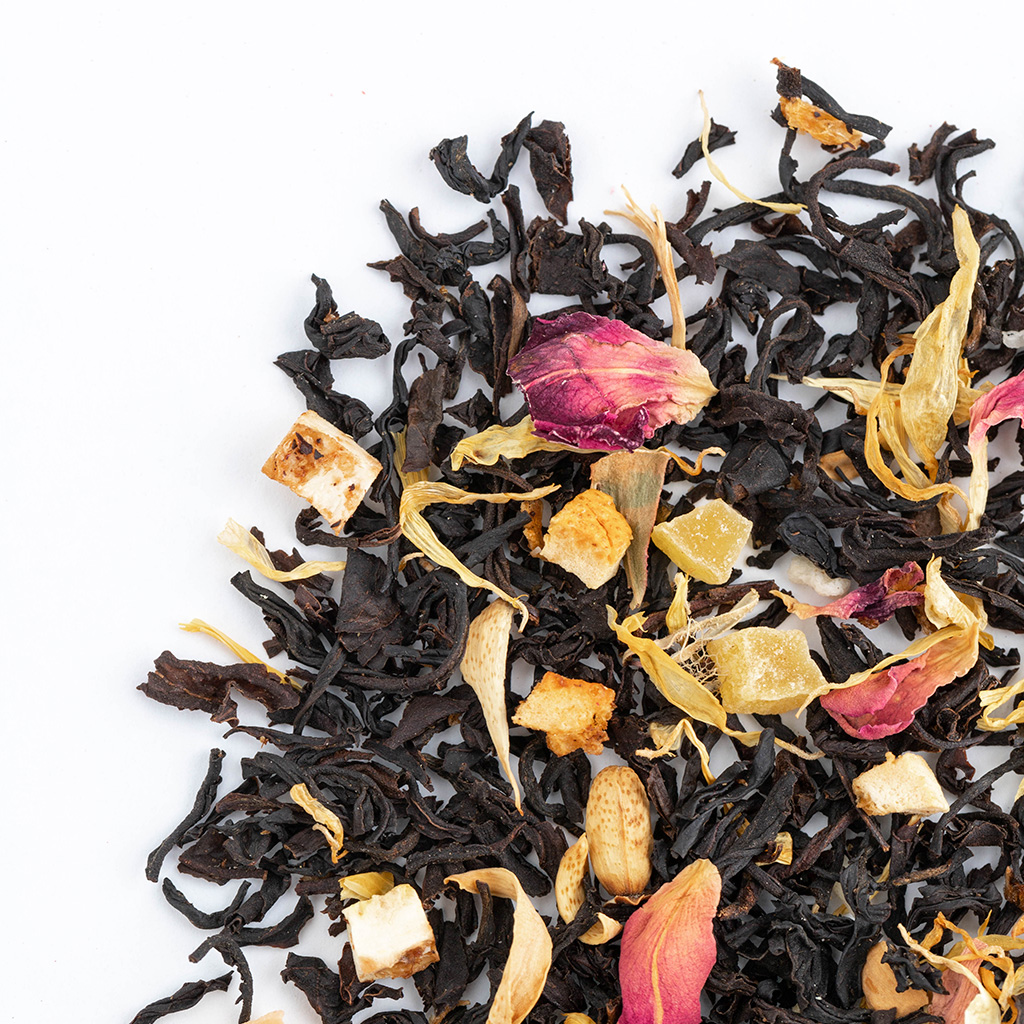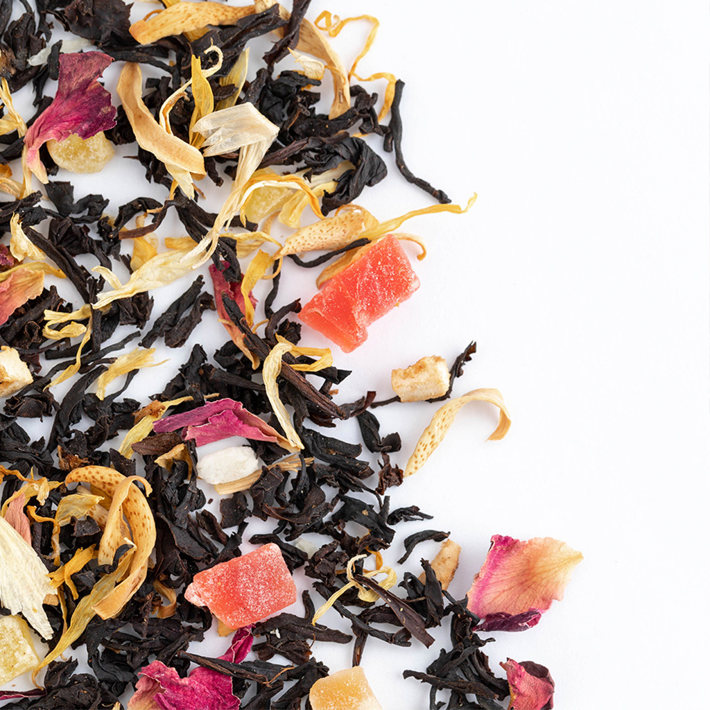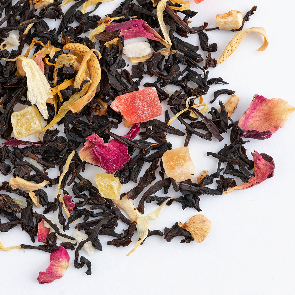 Чай черный индийский, кусочки папайи, кусочки ананаса, кусочки апельсина с цедрой, кусочки лимона с цедрой, кокосовая стружка, лепестки розы, лепестки календулы, аромат тропических фруктов.