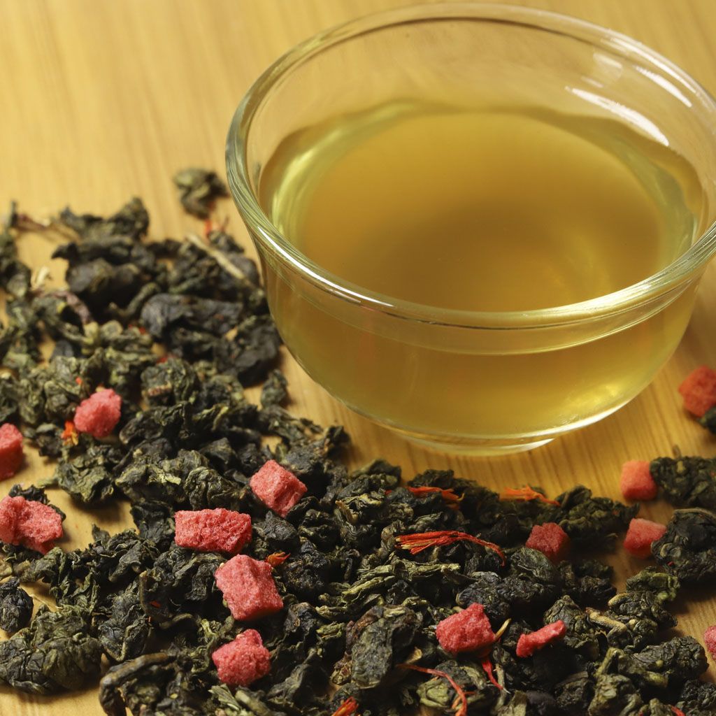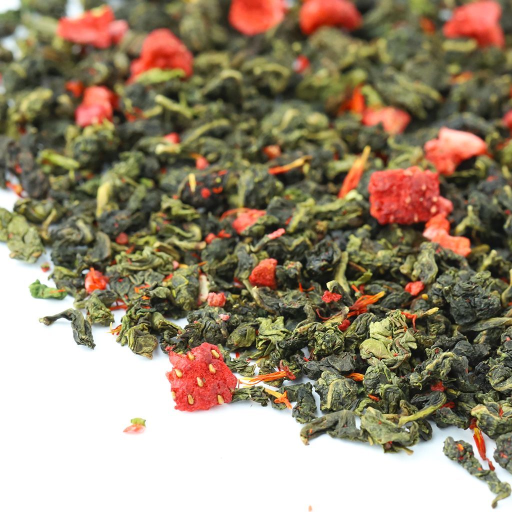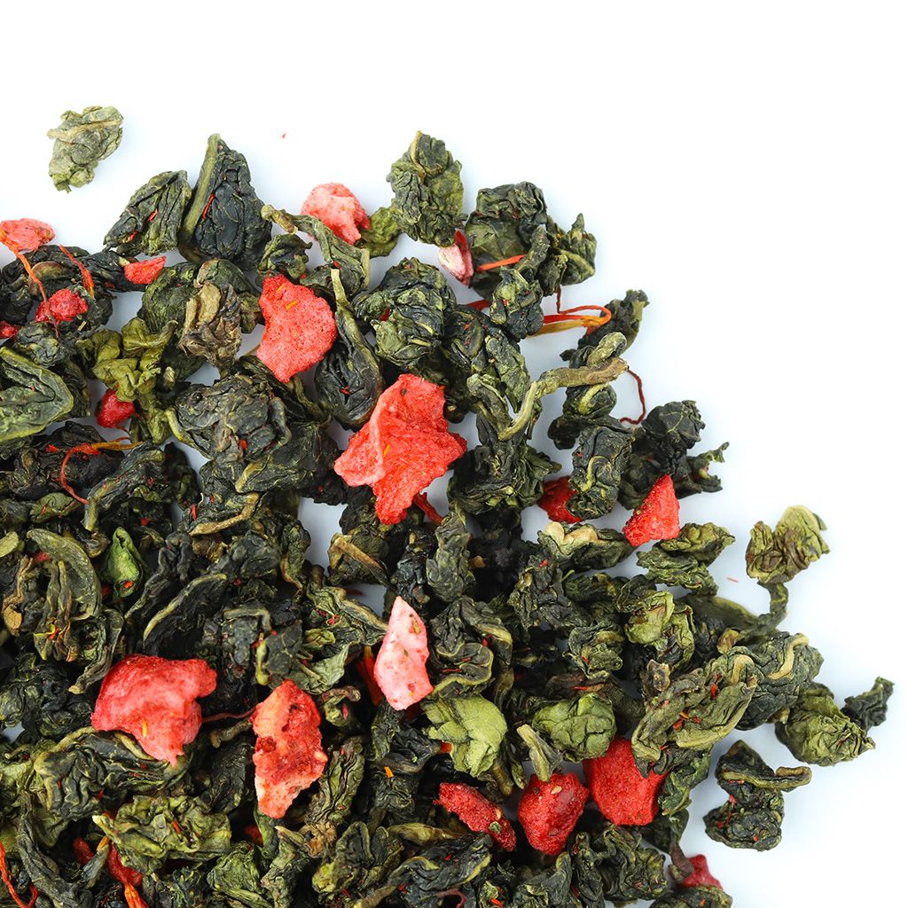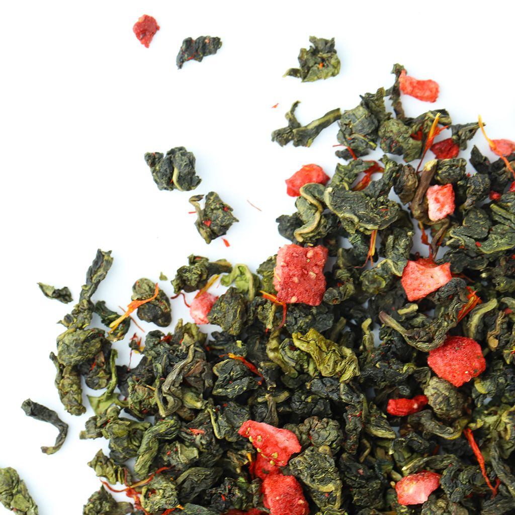 Популярный полу ферментированный чай, относящийся к категории Улунов в сочетании с кусочками клубники.