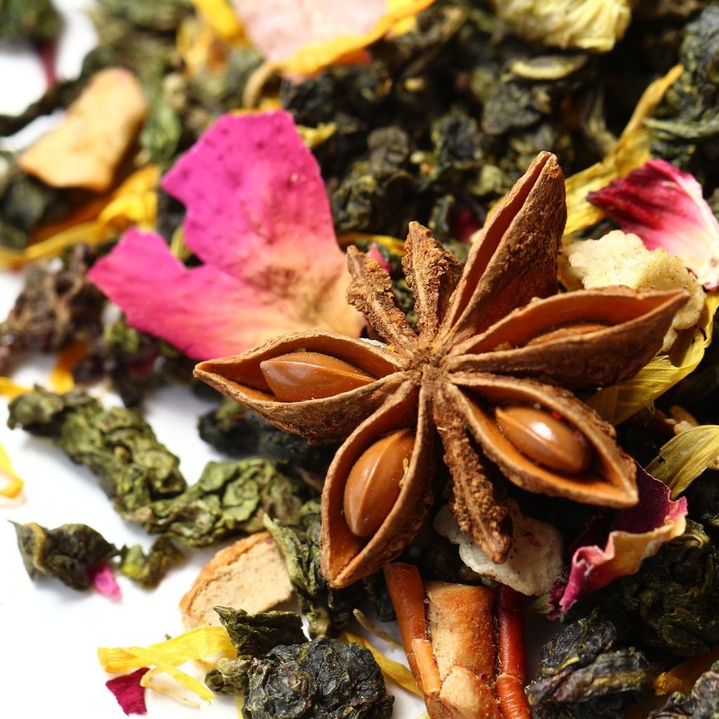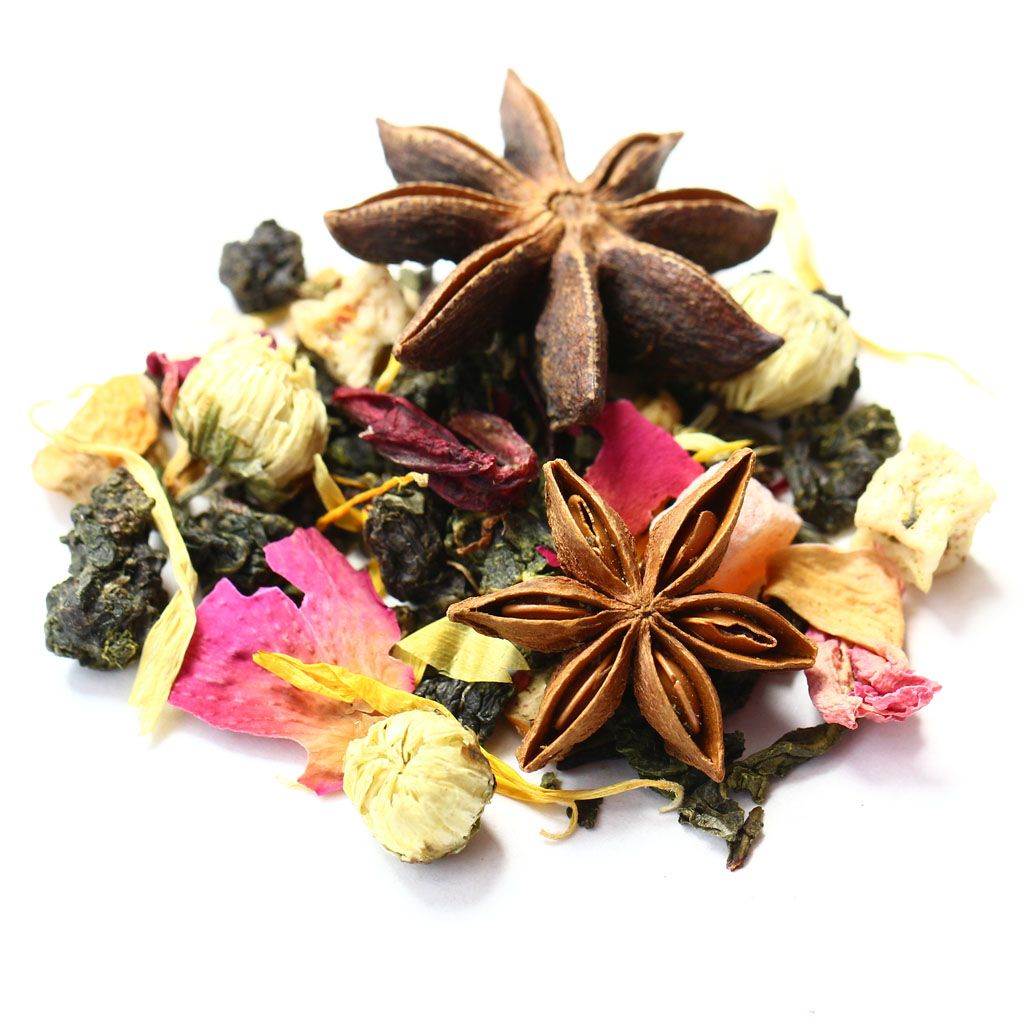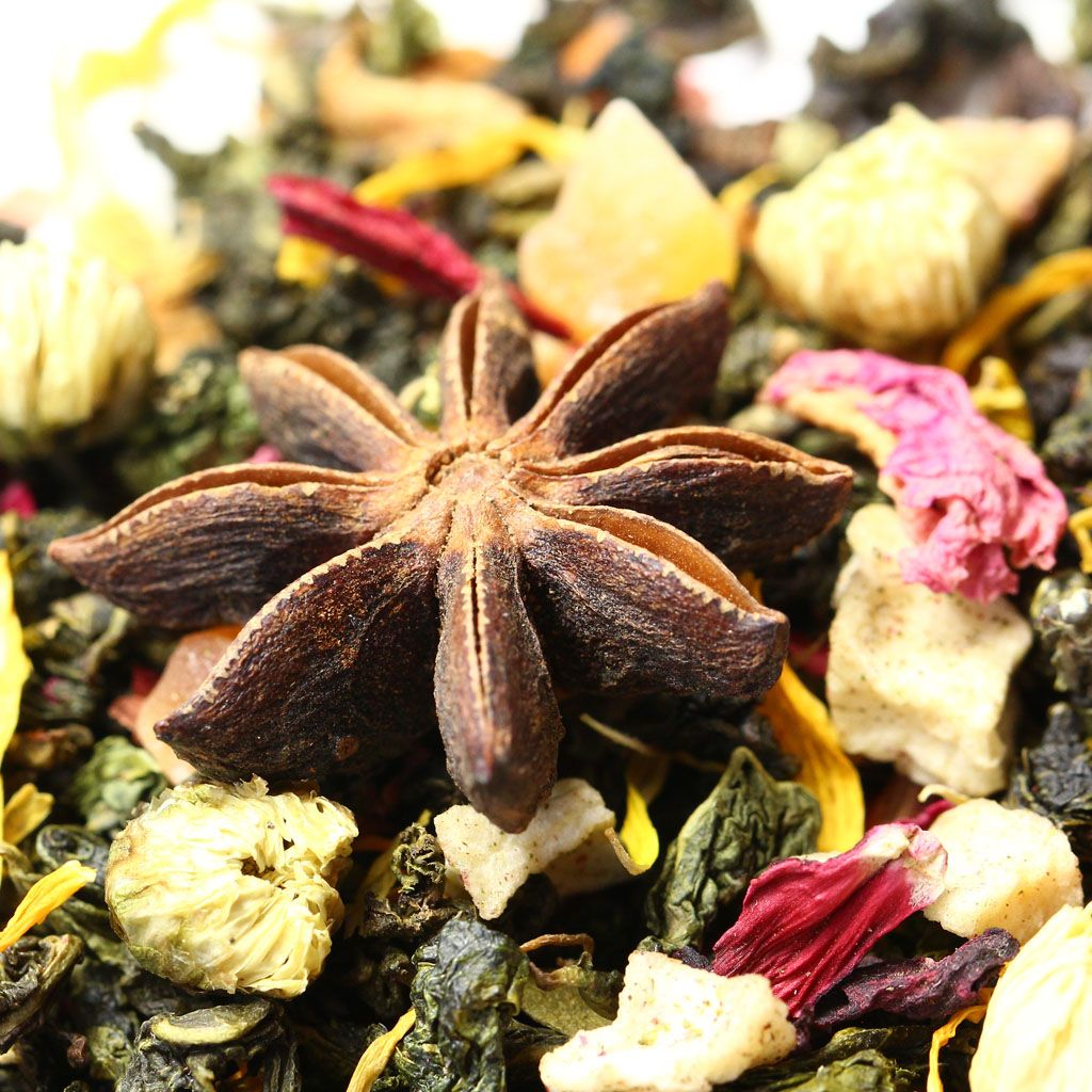Звездочки пряного бадьяна и объемные бутоны китайской ромашки усеивают россыпь скрученных чайных листочков китайского улуна, разбавленную лепестками гибискуса, розы и календулы с проблесками кусочков яблока  цветущий коралловый риф в чайной чашке.