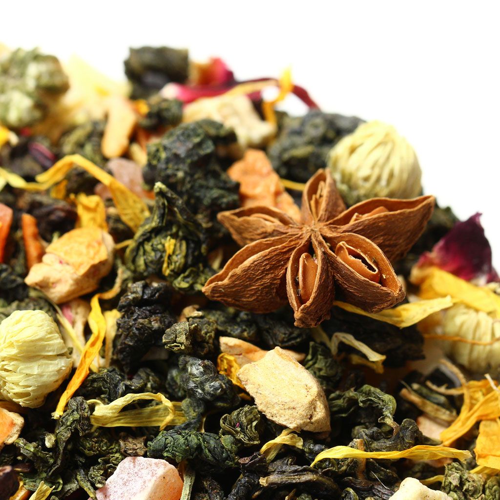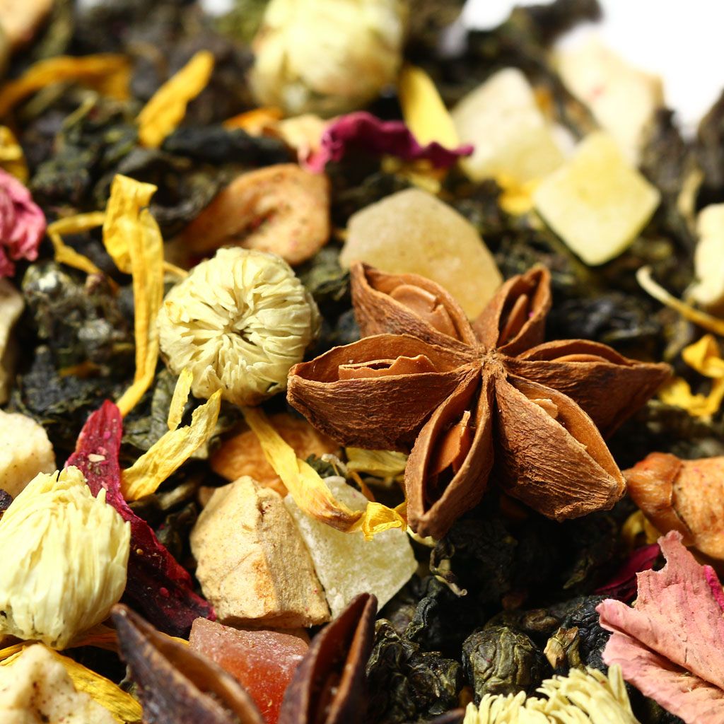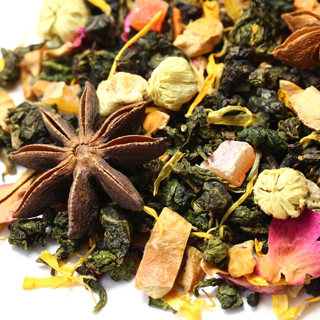 Звездочки пряного бадьяна и объемные бутоны китайской ромашки усеивают россыпь скрученных чайных листочков китайского улуна, разбавленную лепестками гибискуса, розы и календулы с проблесками кусочков яблока  цветущий коралловый риф в чайной чашке.