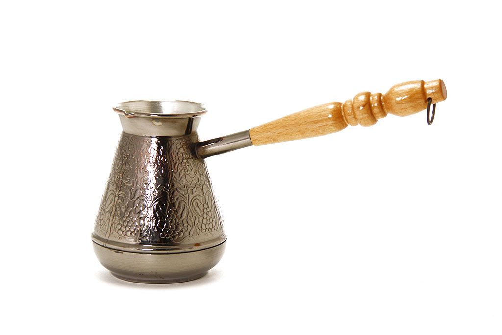 Медная турка конической формы, с длинной деревянной ручкой, объемом 500 мл.