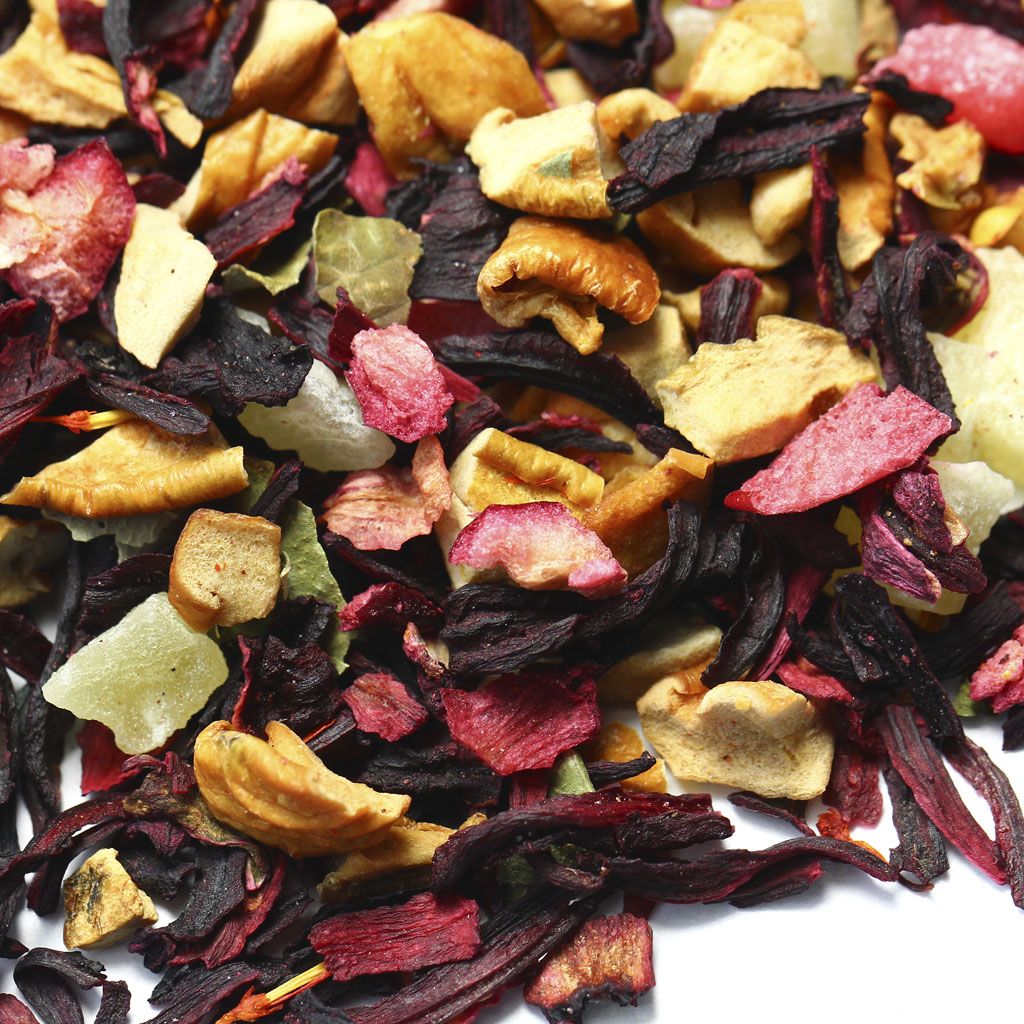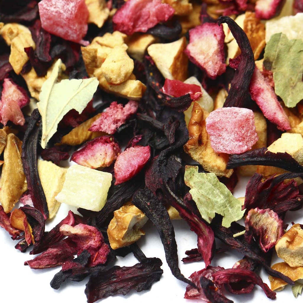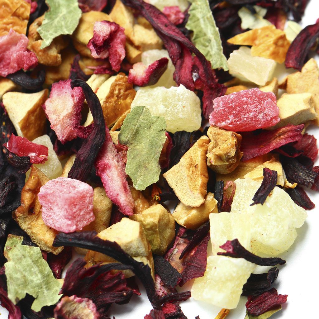 Каркадэ, кусочки яблок, кусочки ананаса, кусочки клюквы, листья смородины, аромат вишни.