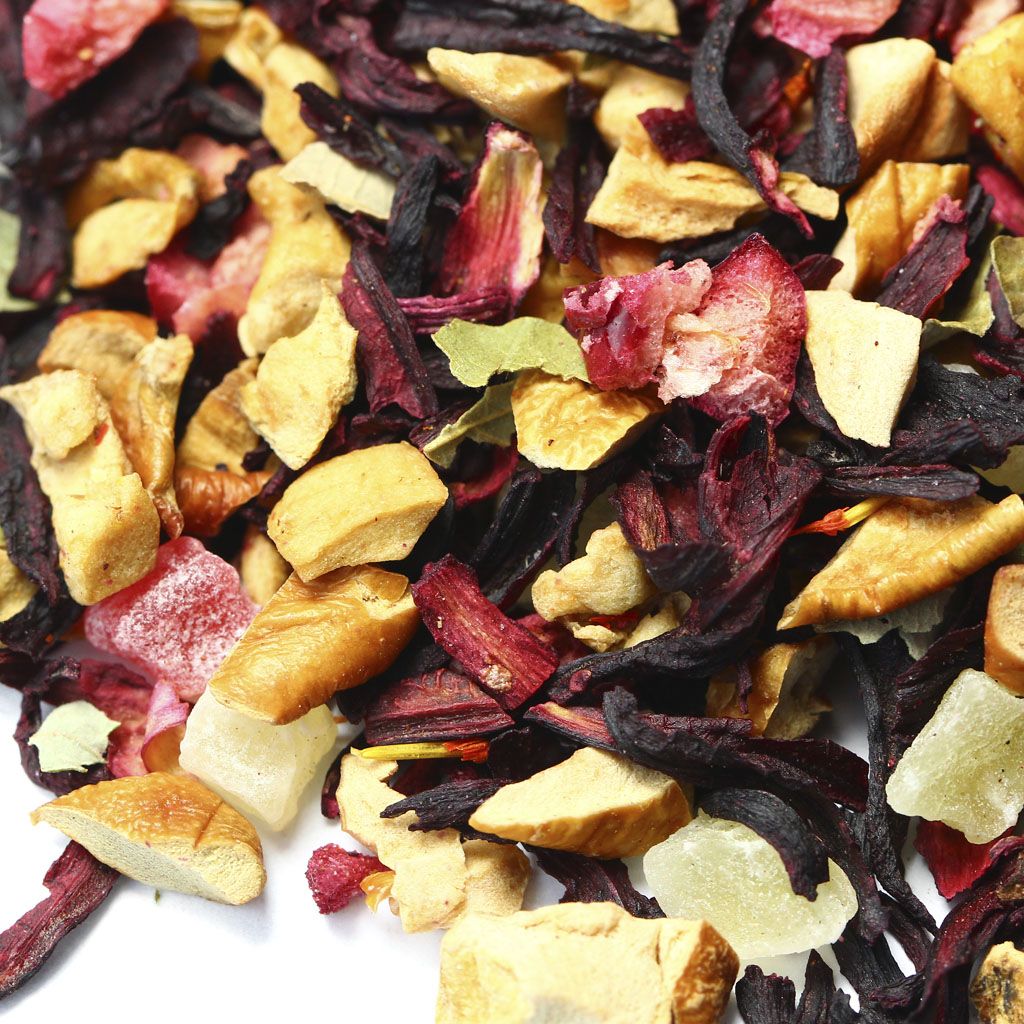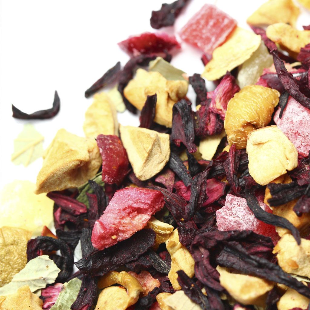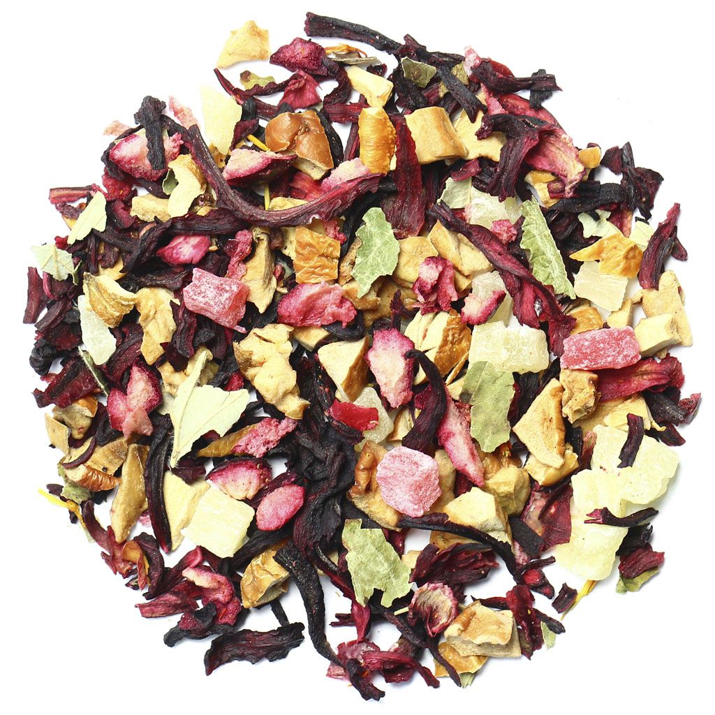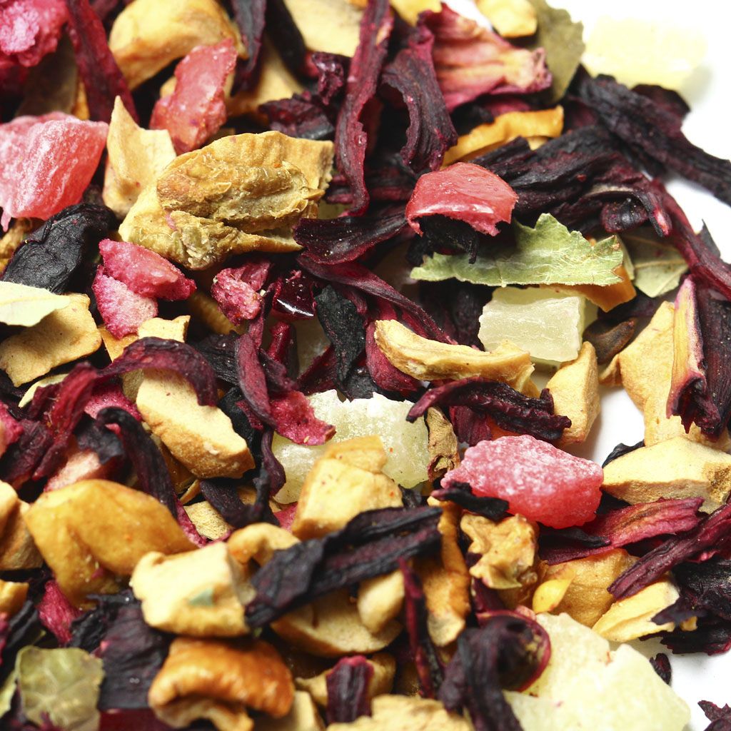 Каркадэ, кусочки яблок, кусочки ананаса, кусочки клюквы, листья смородины, аромат вишни.