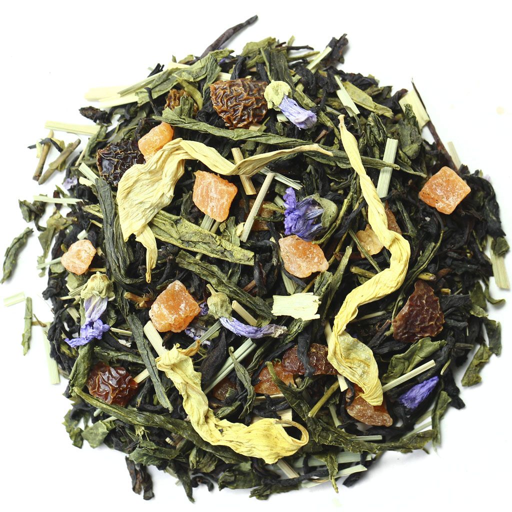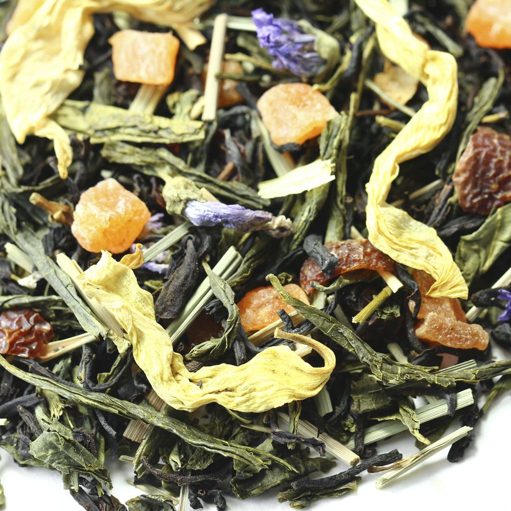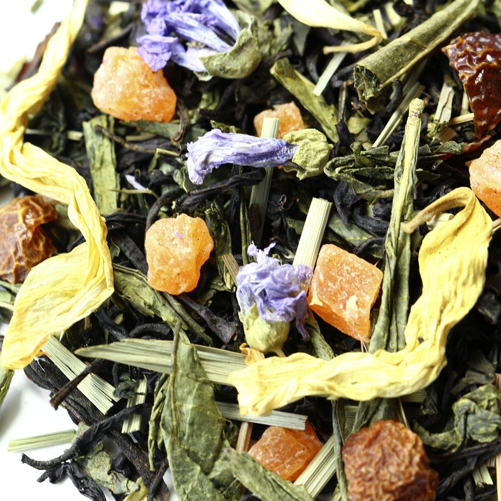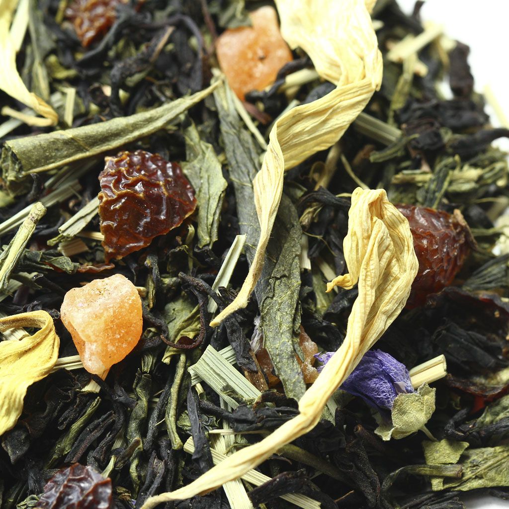Чай зеленый китайский Сенча, чай черный индийский, лемонграсс, кусочки ананаса, плоды шиповника измельченные, цветы мальвы, лепестки подсолнечника, аромат сладких фруктов