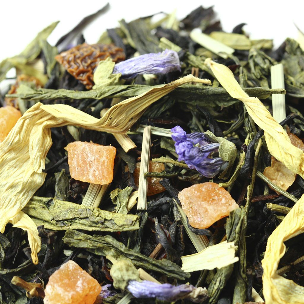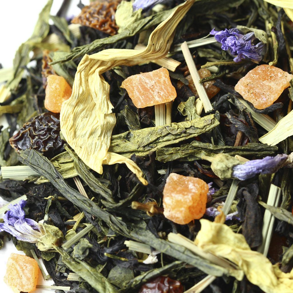 Нотки тропического ананаса и кислинка шиповника главные фигуранты вкуса янтарного напитка. Необычное сочетание чёрного и зеленого чая, вмещающего аромат сладких фруктов, подарит бархатистое послевкусие.