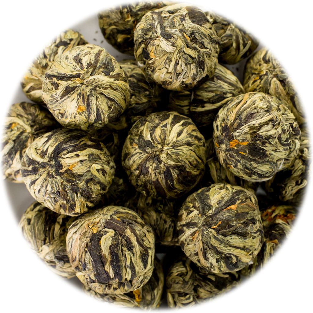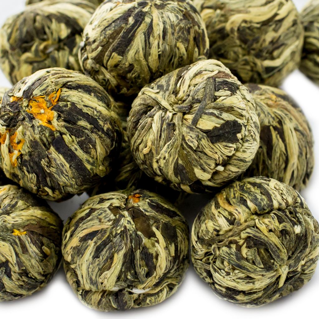 Выращивают в провинции Фуцзянь. Связанный в шарик, чай распускается цветком, в сердце композиции которого расположены цветки календулы.