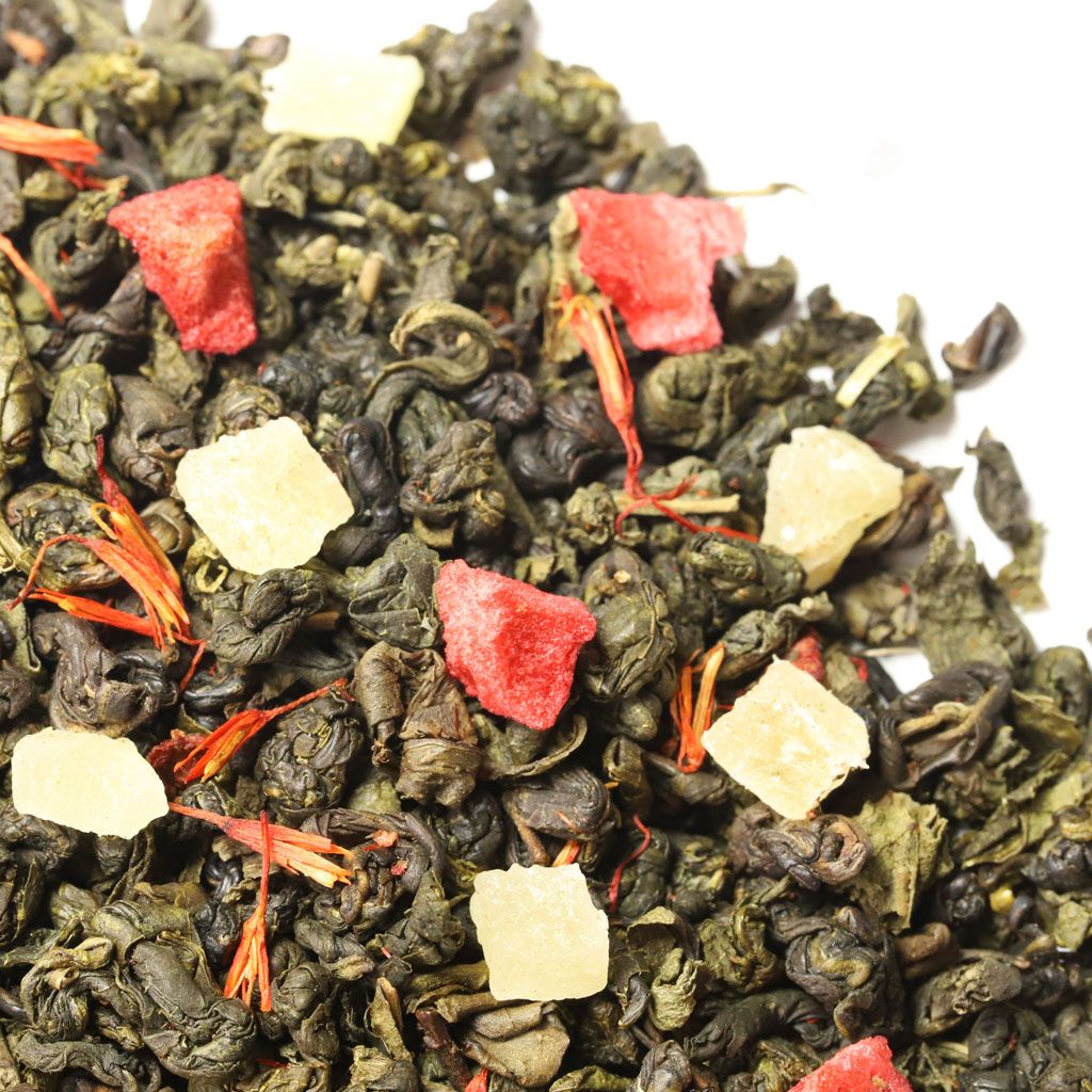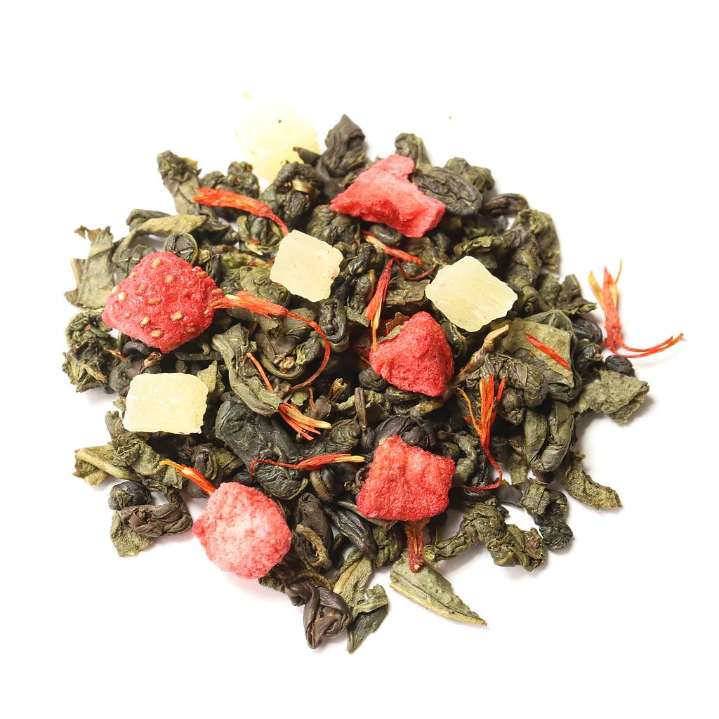 Чай зеленый китайский, кусочки ананаса, кусочки клубники, лепестки сафлора, аромат клубники и сливок.