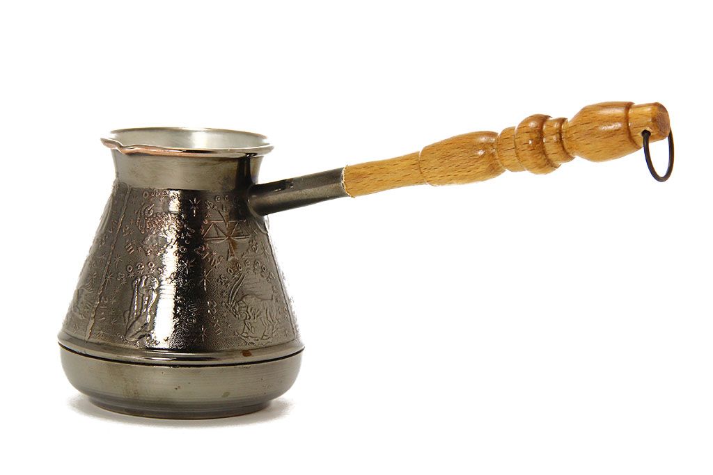 Медная турка конической формы, с длинной деревянной ручкой, объемом 400 мл.
